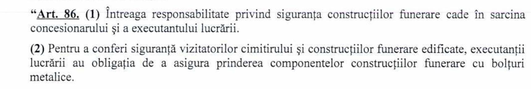 Potrivit Regulamentului de funcționare a cimitirelor din Cluj-Napoca, HCL 300/2014, art 86 alineatul 1: „Întreaga responsabilitate privind siguranța construcțiilor funerare cade în sarcina concesionarului și a executantului lucrării”. În plus, aceștia au obligația de se asigura că monumenetle funerare sunt prinse în bolțuri metalice.