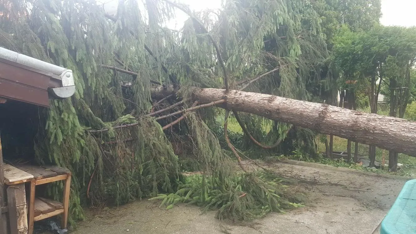 O familie din Cluj-Napoca, care locuiește într-o casă din cartierul Grigorescu, a avut ghinionul de a se trezi cu doi brazi de 45 de metri înălțime răsturnați peste casă, în urma furtunii puternice care a avut loc duminică seara.