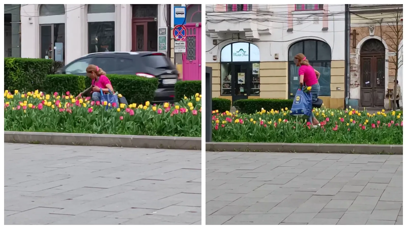 O femeie a fost filmată în Piața Mihai Viteazu în timp ce rupea de zor superbele lalele plantate din banii clujenilor.