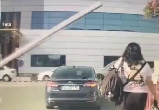 Cu toate că fix lângă ea se află un trotuar, pe care trebuie să se deplaseze pietonii, femeia continuă să se deplaseze în rând cu mașinile. Din nefericire, în timp ce își vedea linistită de drum, după ce un autoturism a trecut de barieră, aceasta a început să coboare, lovind femeia în cap.