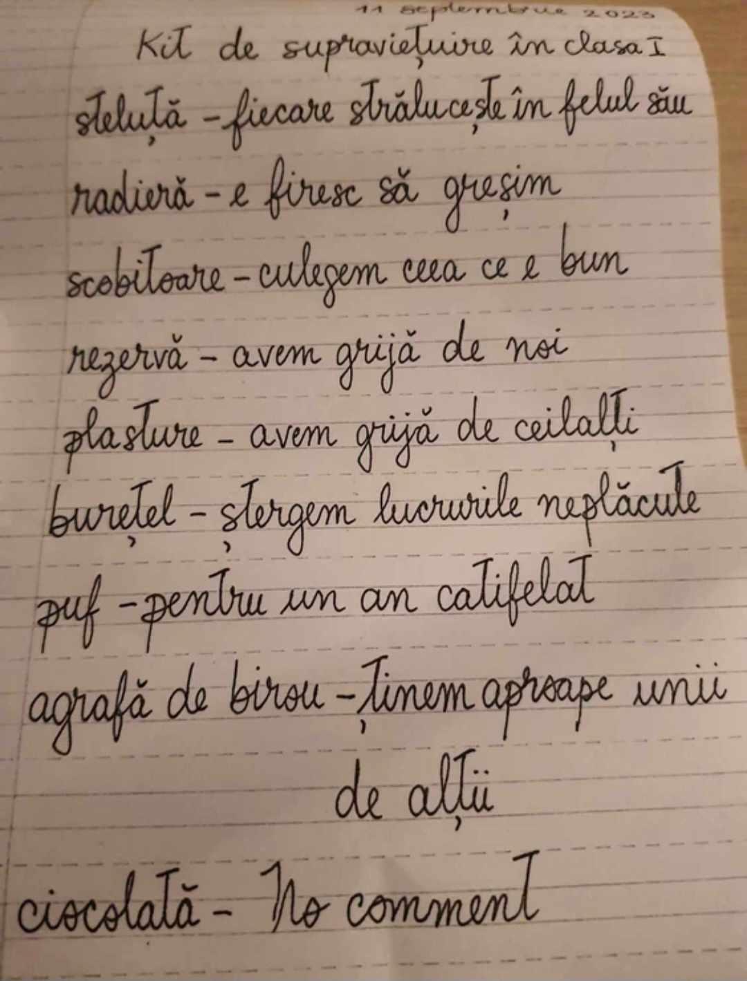 Rodica Gavriș-Pascu, de la Școala Gimnazială „Nicolae Titulescu” a pregătit un „kit de supraviețuire în clasa I”, adică un plic în care erau mai multe obiecte și o scrisorică, în care, scris cu litere de mână, era explicată semnificația fiecărui obiect: O steluță (abțibild) - fiecare strălucește în felul său; o radieră - e firesc să greșim; o scobitoare - culegem ceea ce e bun; rezervă (de stilou-nr) - avem grijă de noi; un plasture- avem grijă de ceilalți; un burețel – ștergem lucrurile neplăcute; puf – pentru un an catifelat; agrafă de birou – ținem aproape unii de alții; ciocolată – no comment.