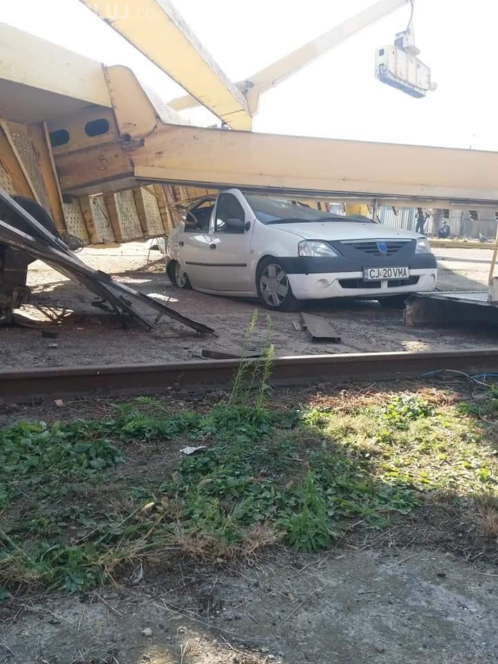 Din primele informații, se pare că ”Dorel” macaragiul a vrut să-și demonteze ”jucăria”, dar lucrurile au scăpat de sub control, iar toată instalația a căzut peste un autoturism marca Dacia Logan.