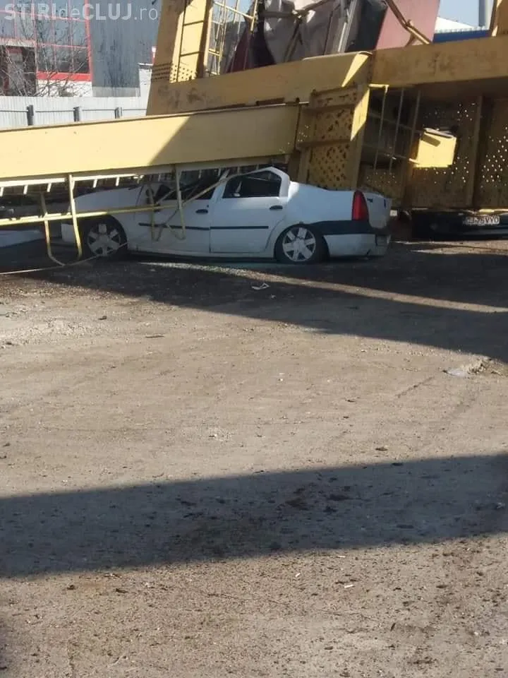 O macara industrială s-a prăbușit pe un șantier de pe strada Fabricii de Zahăr, din Cluj-Napoca, și a făcut praf un autoturism.