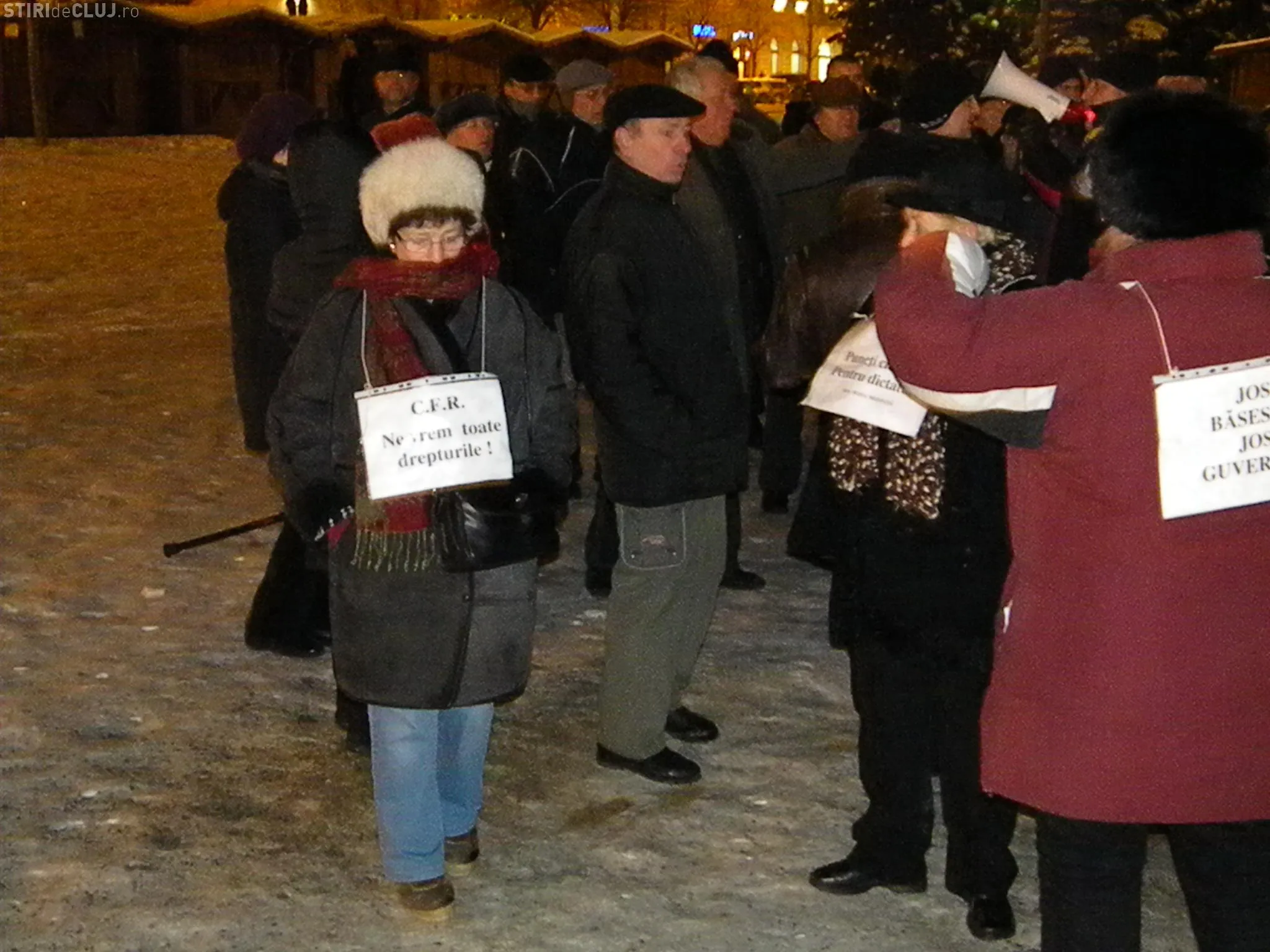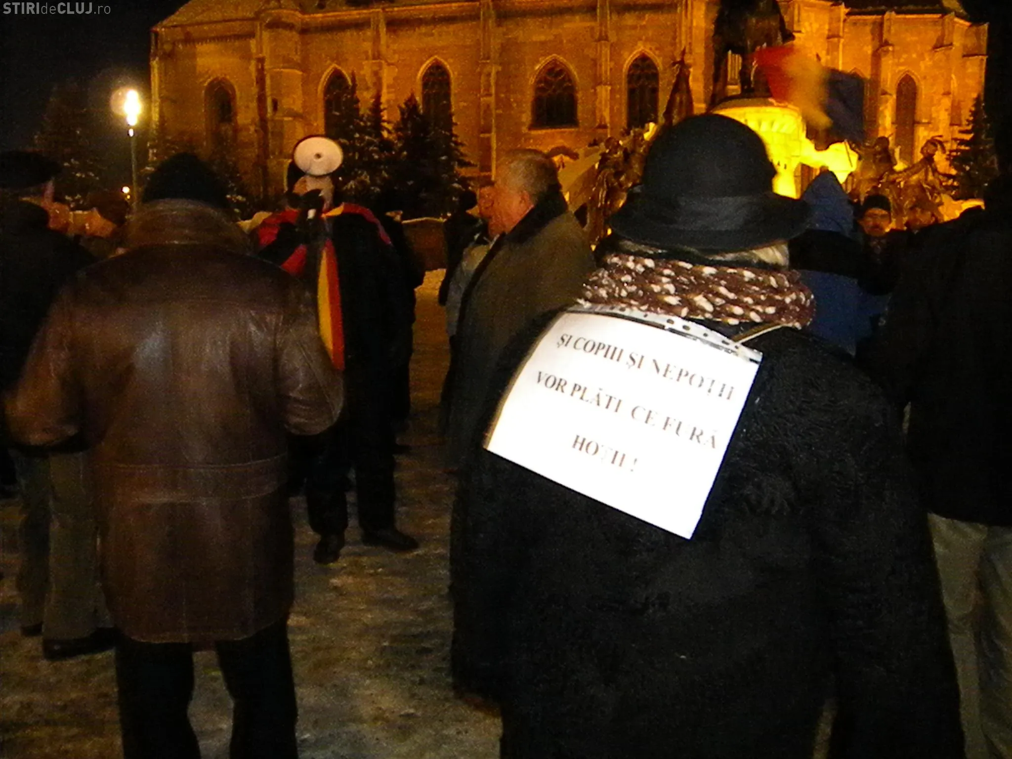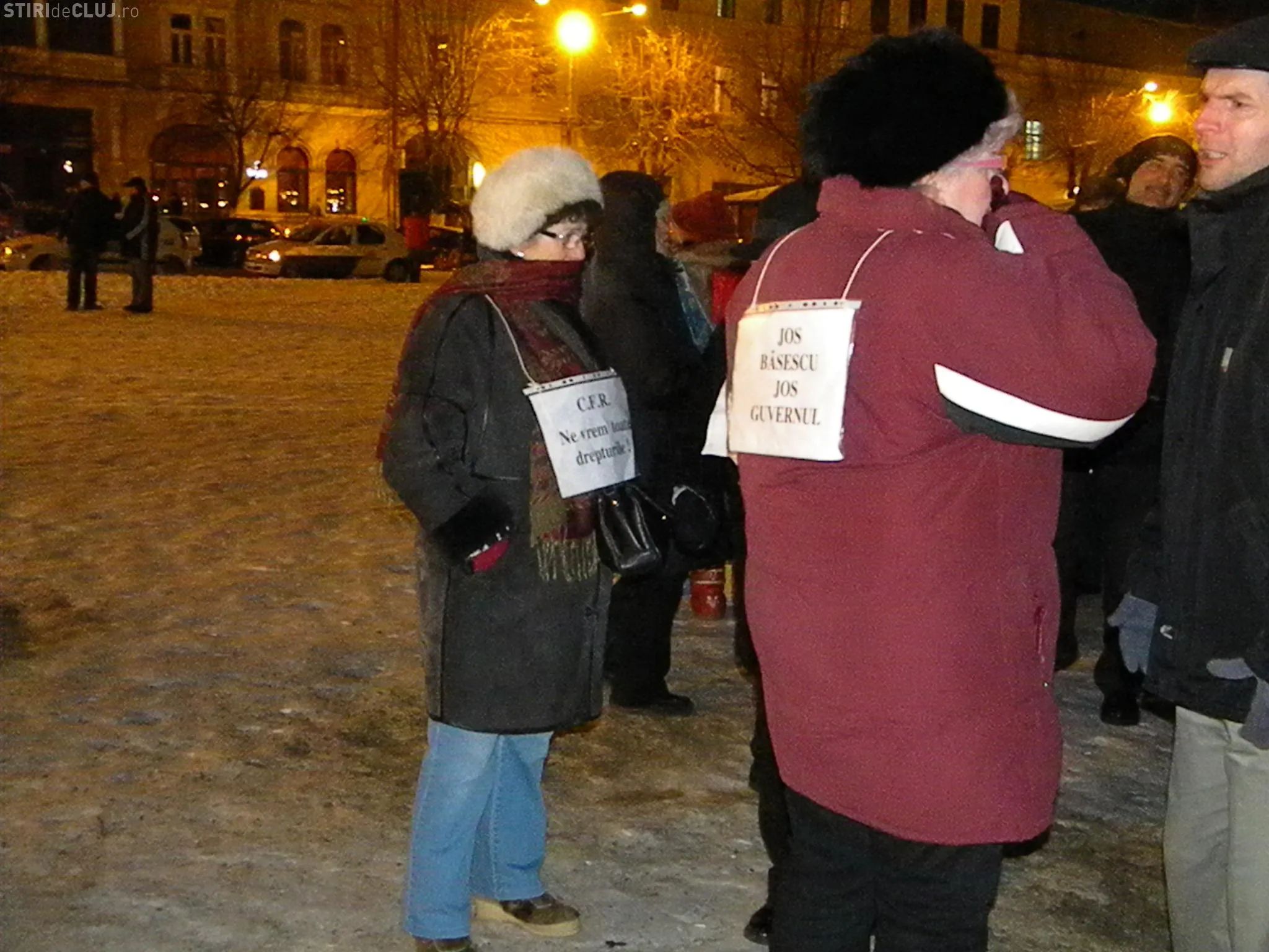 Circa 60 de clujeni s-au strans in Piata Unirii de la ora 18.00 pentru a protesta impotriva regimului si pentru a duce flacara "revolutiei" mai departe. Cu putine exceptii, vorbim numai despre persoane in varsta.