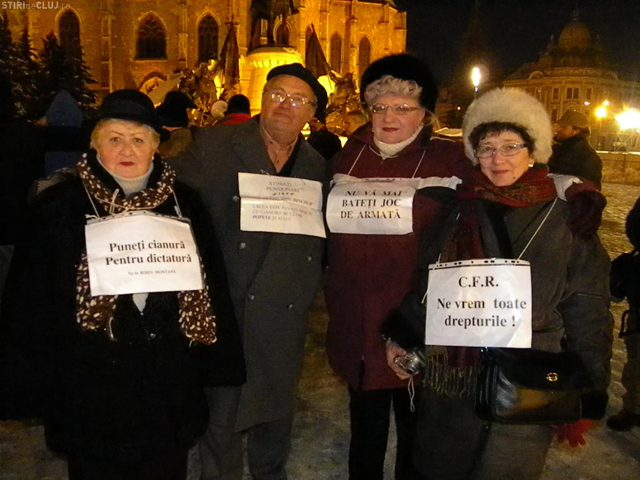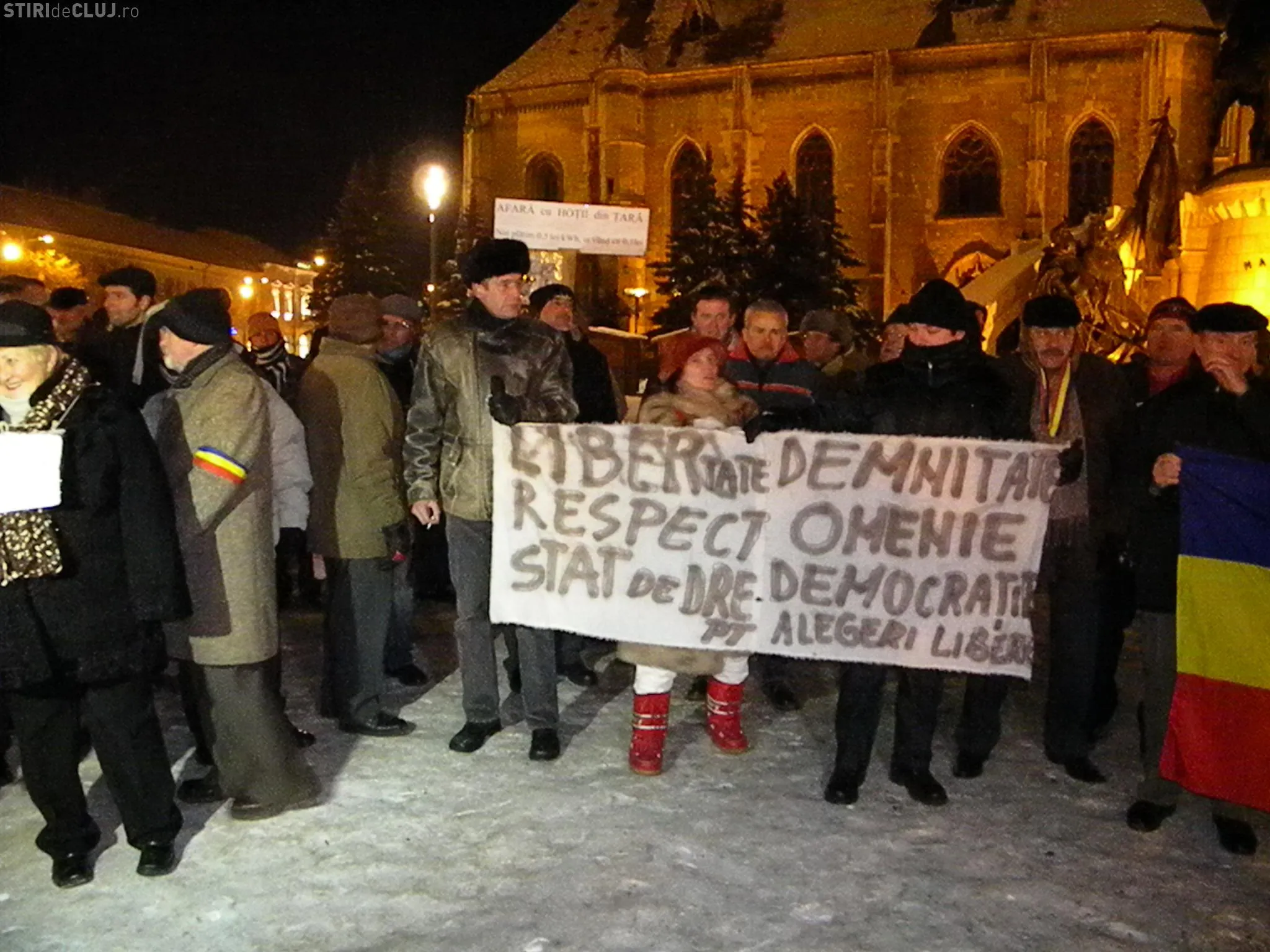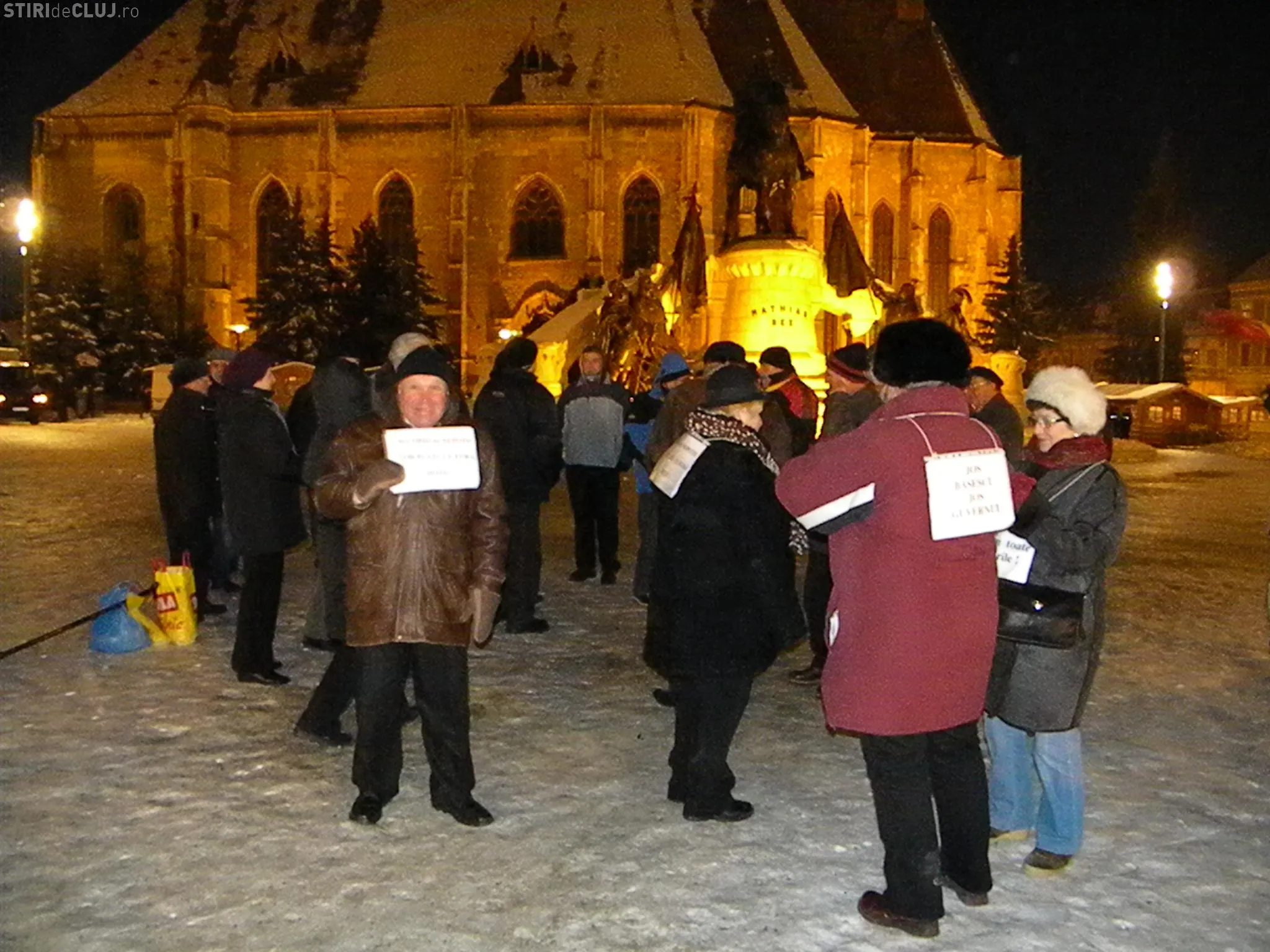 Circa 60 de clujeni s-au strans in Piata Unirii de la ora 18.00 pentru a protesta impotriva regimului si pentru a duce flacara "revolutiei" mai departe. Cu putine exceptii, vorbim numai despre persoane in varsta.