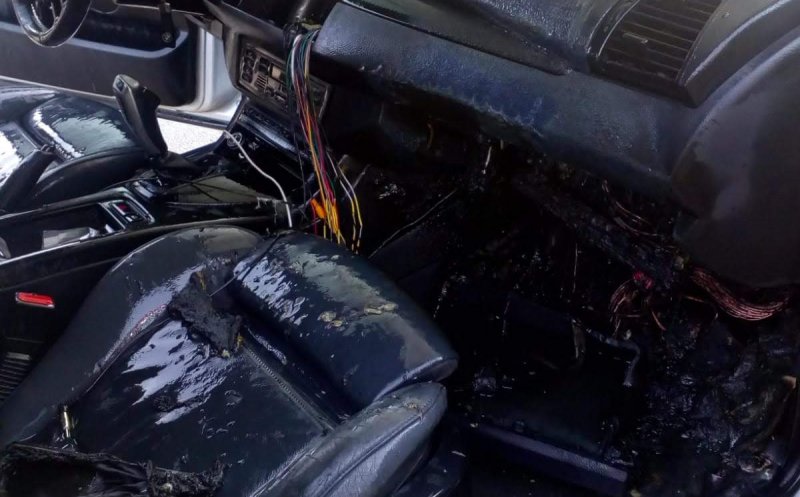 Flăcările au deteriorat bordul, parbrizul și o parte din compartimentul motor al mașinii.