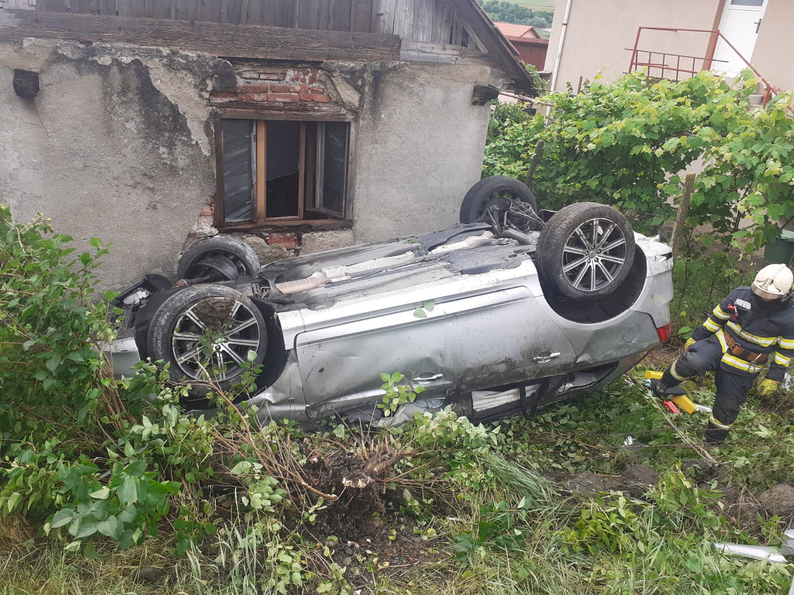 O mașină a sărit de pe drum și s-a răsturnat în curtea unei case din Copăceni.