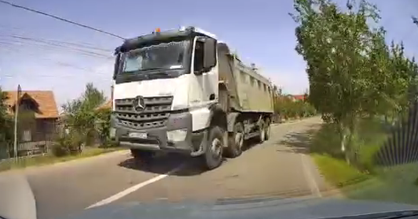Mai exact, o mașină de mare tonaj a tăiat o curbă și a ieșit în fața unui șofer, care a evitat impactul în ultima secundă.