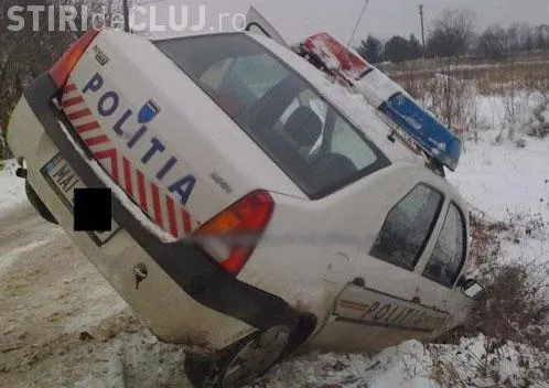 O masina de politie aflata in misiune a ajuns in sant la intrare in Gherla, din cauza zapezii! - FOTO