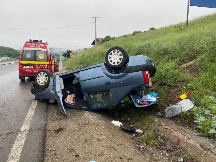 O mașină s-a răsturnat la ieșire din Vâlcele, pe drumul spre Cluj-Napoca - FOTO