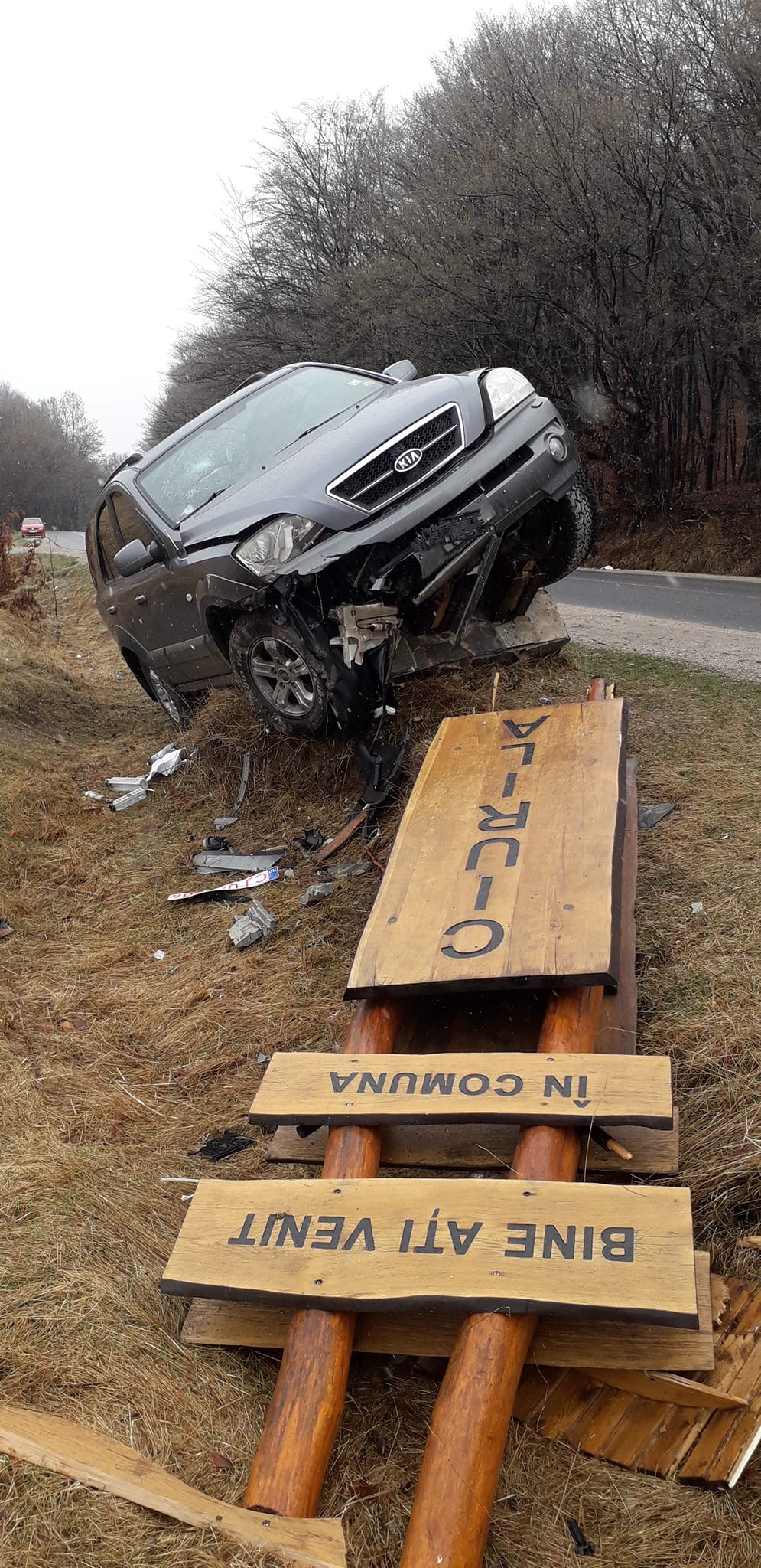 Un șofer a demolat troița de la intrare din comuna Ciurila, iar mașina a rămas înfiptă în soclu.