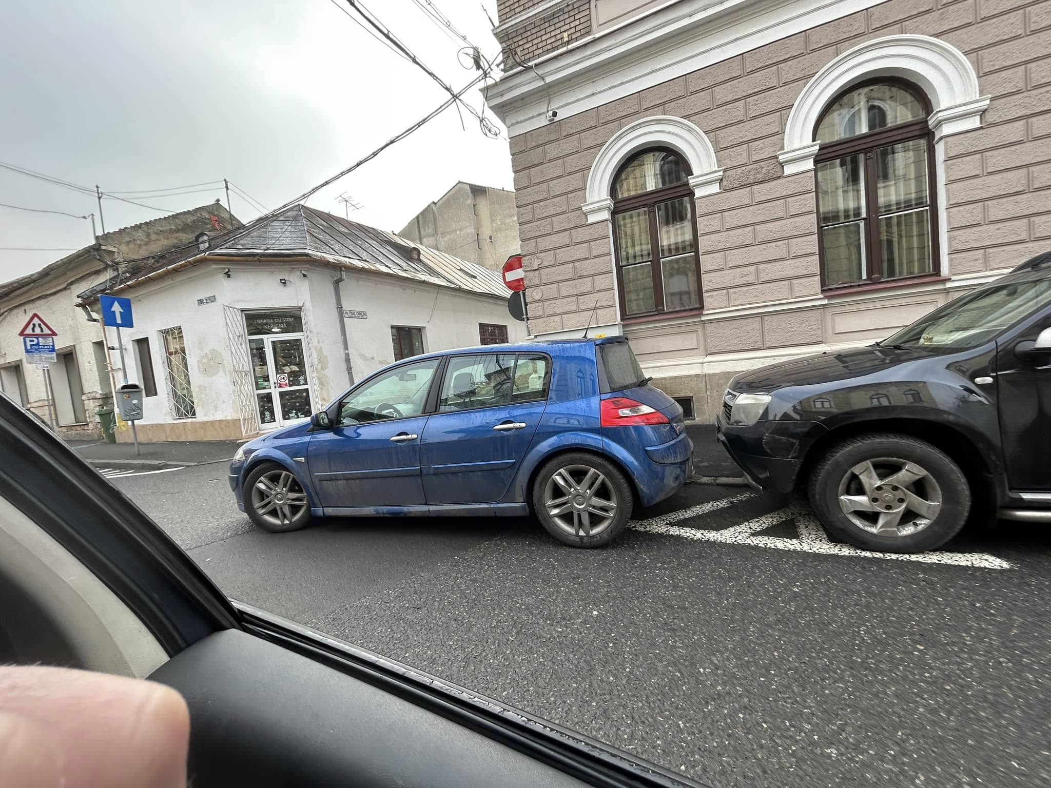 Imaginea a fost surprinsă sâmbătă dimineața, șoferul lăsându-și mașina parcată jumătate într-un loc de parcare de pe strada Constantin Daicoviciu, și cealaltă jumătate în intersecție. Fotografia a fost postată ulterior pe un grup destinat șoferilor din Cluj-Napoca, unde a stârnit o dezbatere între doi clujeni.