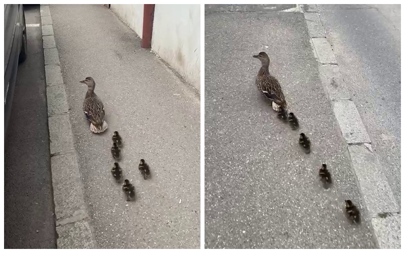O rață cu cinci boboci a fost escortată prin tot centrul Clujului spre Canalul Morii - VIDEO