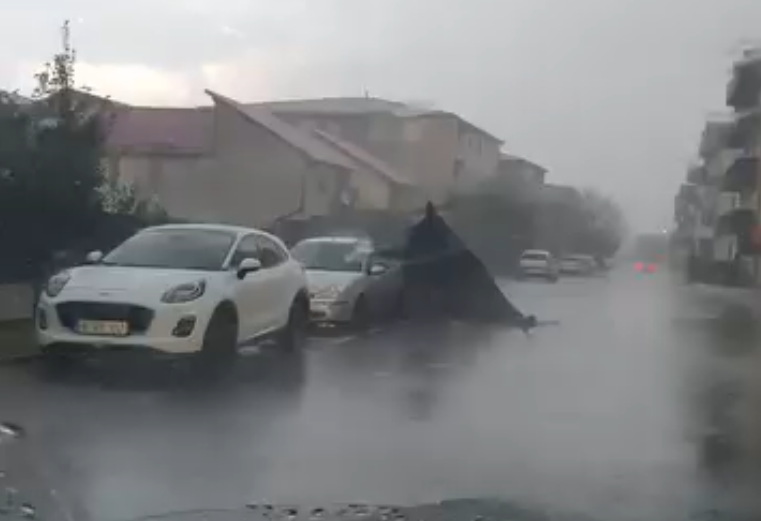 Un clujean a surprins și a postat pe un grup destinat șoferilor din Cluj-Napoca un videoclip cu o umbrelă uriașă care a fost luată de vânt în urma vijeliei din această seară. În imagini se poate vedea cum umbrela, desprinsă de pe terasa unui bloc de la etajul 4, a zburat și a aterizat lângă mașinile parcate regulamentar.