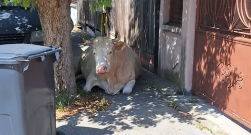 O vacă a fost suprinsă odihnindu-se la umbră pe o stradă din Cluj-Napoca.