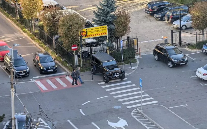 Conform fotografiei, mașina pare că vrea să traverseze strada pe trecerea de pietoni, ocupând în totalitate trotuarul și o bună parte din zebră.