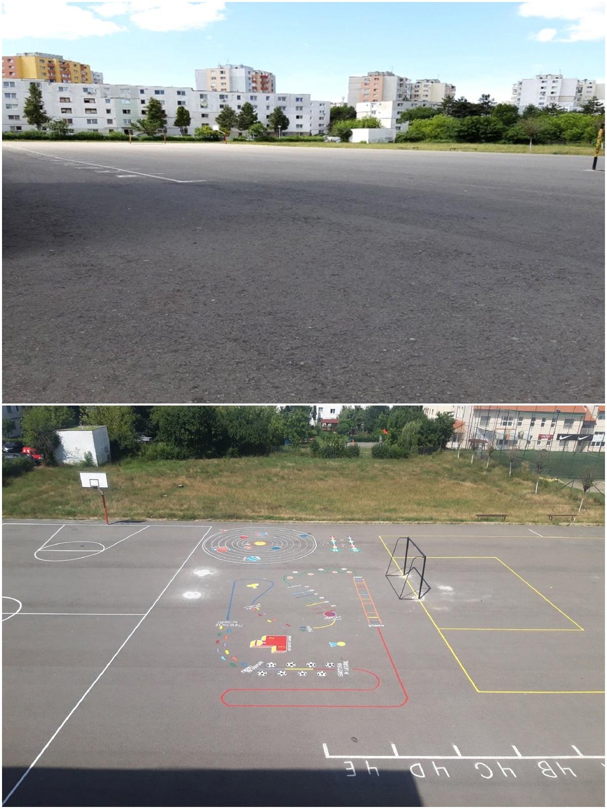 Practic, părinții, elevii și profesorii s-au pus pe treabă și cu materialele achiziționate în urma concursului de înot Swimathon au refăcut curtea și holul. ”În locul unui spaţiu imens şi gri, am ales trasarea unui teren de baschet, unul de fotbal, un circuit sportiv care să dezvolte deprinderile motrice de bază, un şotron care să ne ducă în sfera educaţiei nonformale (prin joacă şi culoare ei au posibilitatea să înveşe mult mai uşor numerele şi principalele operaţii din matematică) şi sistemul solar”, au mai spus coordonatoarele proiectului.