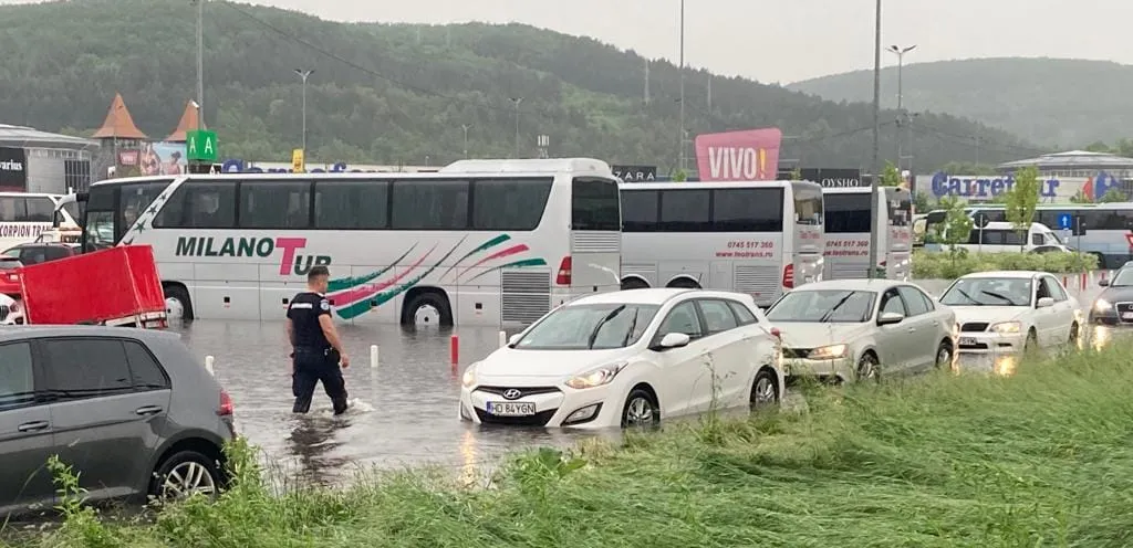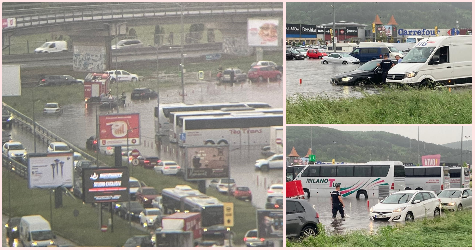 Opt mașini au rămas blocate în ”lacul” format la ieșire din parcarea de la VIVO Cluj, în urma furtunii de miercuri, 24 mai. Vezi AICI VIDEO.