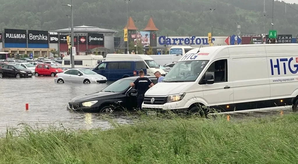 Opt mașini s-au ”înecat” la ieșire din parcarea VIVO, în urma furtunii! Pompierii și jandarmii au intervenit - FOTO