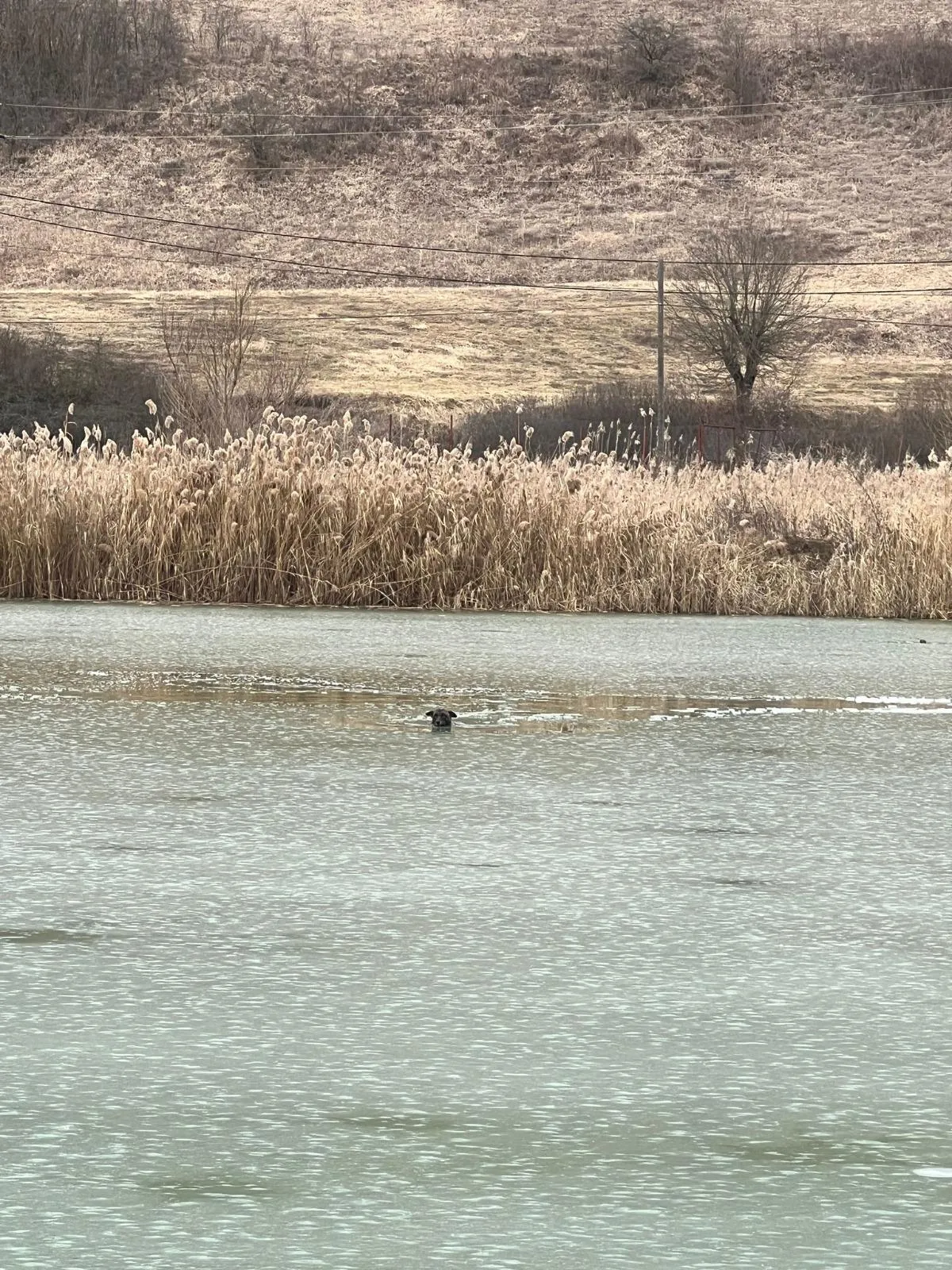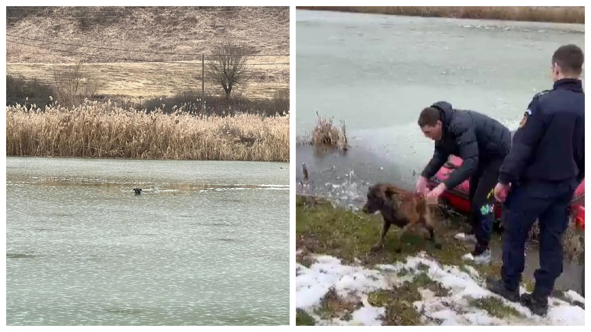 Orice viață contează! Cățel salvat de pompierii clujeni din mijlocul unui lac înghețat