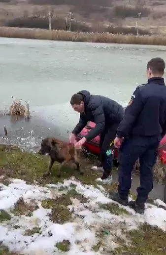 Un câine care a rămas blocat în apele înghețate ale unui lac din Sântioana, comuna Țaga, județul Cluj, a fost salvat de pompieri.