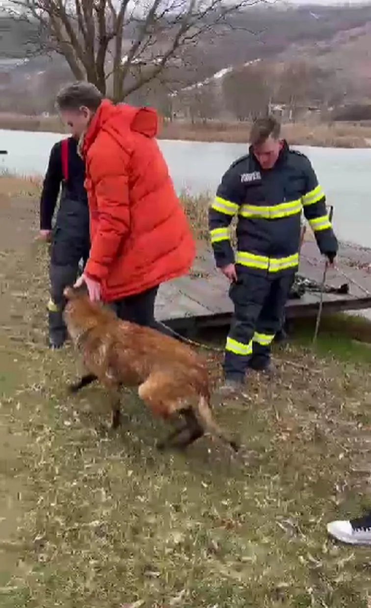 Patrupedul se afla pe lac, când gheața a cedat sub greutatea sa, iar animalul nu a mai putut să iasă la suprafață. Salvatorii sosiți la fața locului au reușit să îl aducă la mal cu ajutorul unei bărci pneumatice.