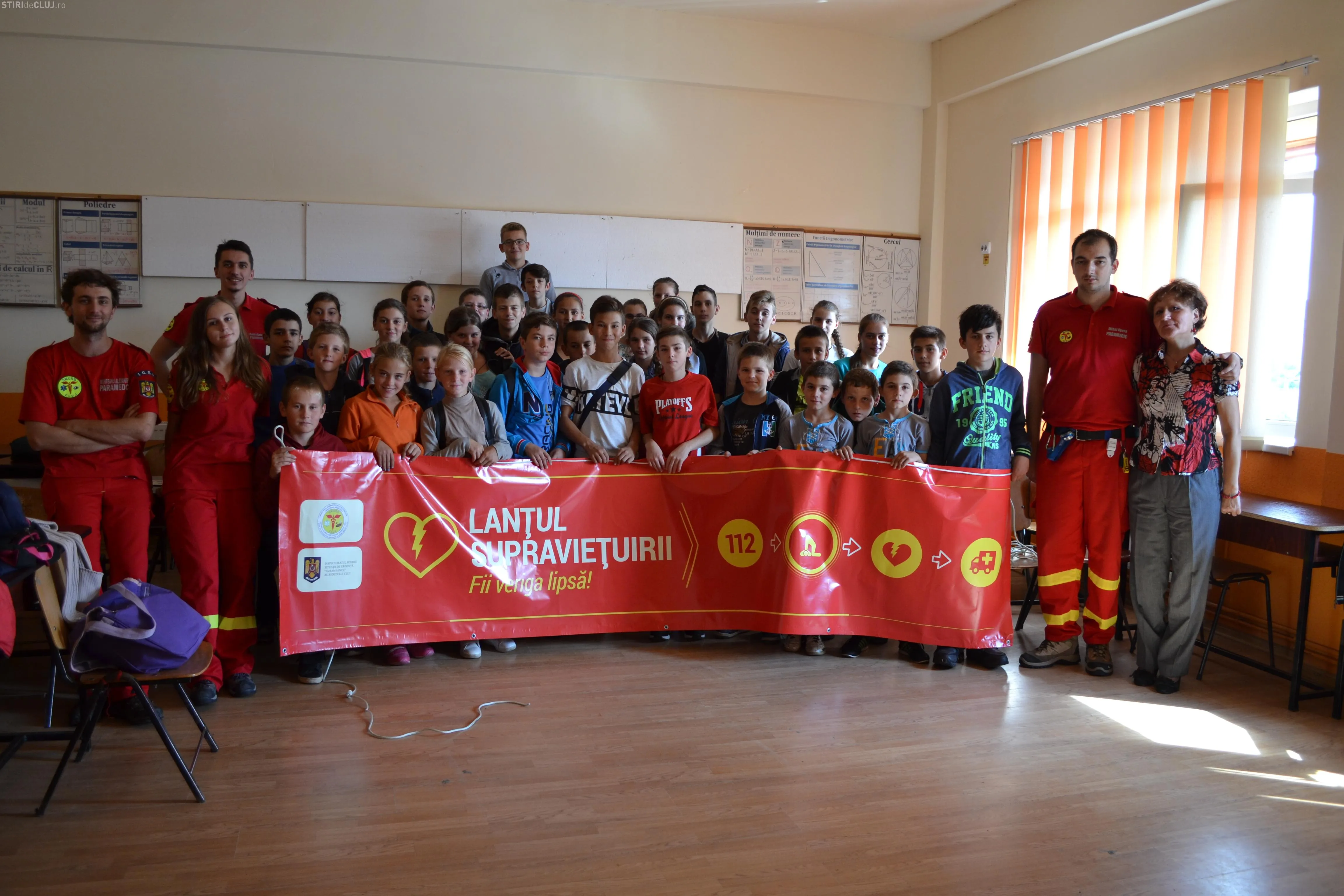 Paramedicii voluntari SMURD Cluj au instruit, vineri, 25 septembrie, mai mult de 100 de copii, elevi ai şcolilor din Iclod şi Livada în cadrul unui proiect intitulat ”Lanţul Supravieţuirii – Fii veriga lipsă!”.
