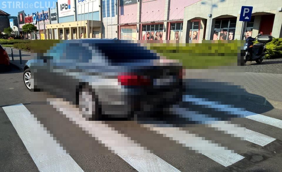 Un șofer de BMW a fost surprins în parcarea de la Polus, ”trântit” cu bolidul fix pe trecerea de pietoni.