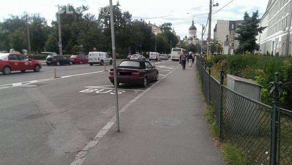 Un șofer clujean și-a lăsat mașina parcată chiar pe banda dedicată mijloacelor de transport în comun, diun Piața Ștefan Cel Mare, din Cluj-Napoca.