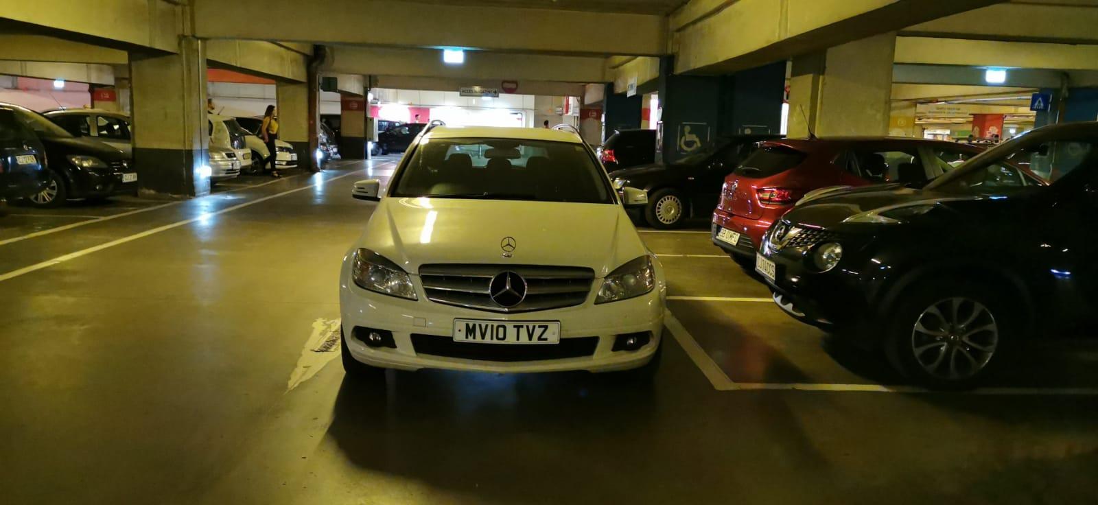 Șoferul unui Mercedes cu numere străine a parcat ca un cocalar veritabil în parcarea subterană de la Iulius Mall Cluj.