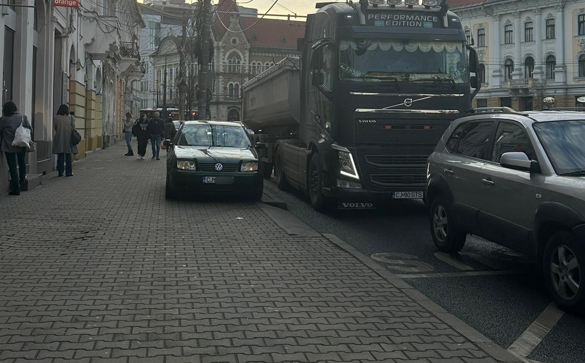 Un șofer și-a parcat mașina pe trotuar în Piața Mihai Viteazu, în dispreț total față de pietoni. Pe de altă parte, probabil lipsa locurilor de parcare în centru îi face pe șoferi să acționeze în mod disperat.