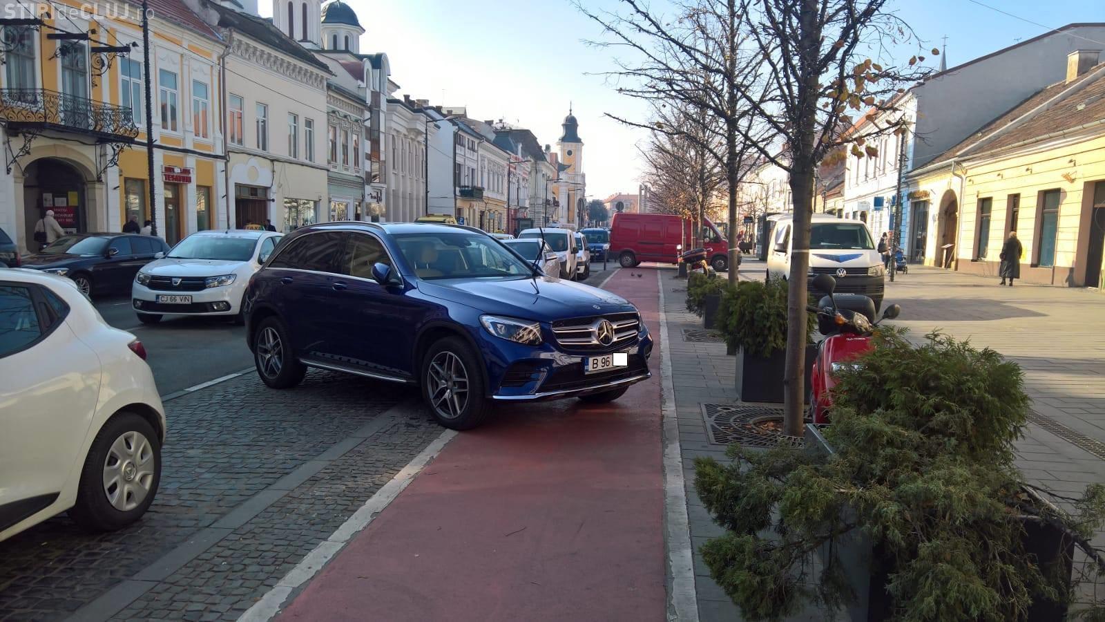 Proprietarul unui SUV marca Merdeces și-a urcat ”tancul” pe pietonala de pe Bulevardul Eroilor, blocând pista de biciclete.