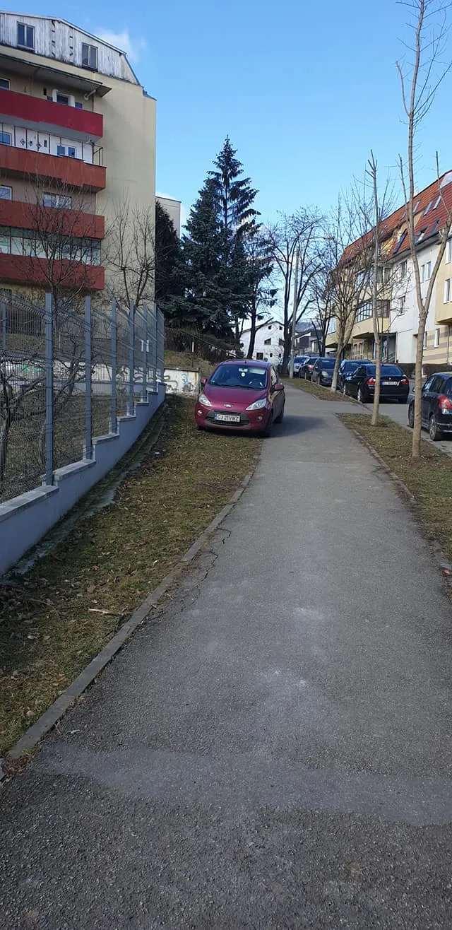 Un șofer și-a parcat mașina pe spațiul verde, în cartierul Zorilor, pe strada Viilor, intrând pe trotuar.