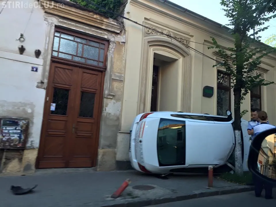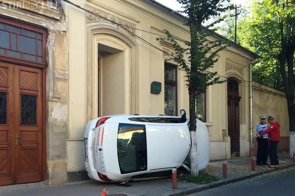 Un șofer a reușit performanța de a se urca cu roțile, complet, pe o clădire de pe o stradă din centrul municipiului Cluj-Napoca.