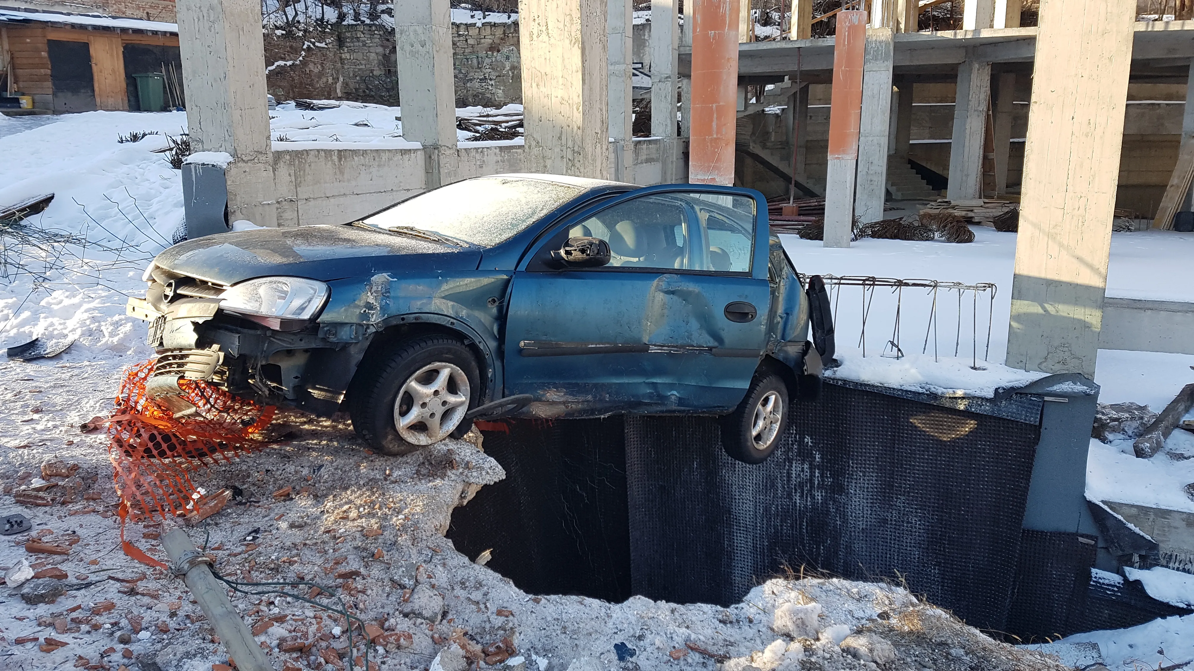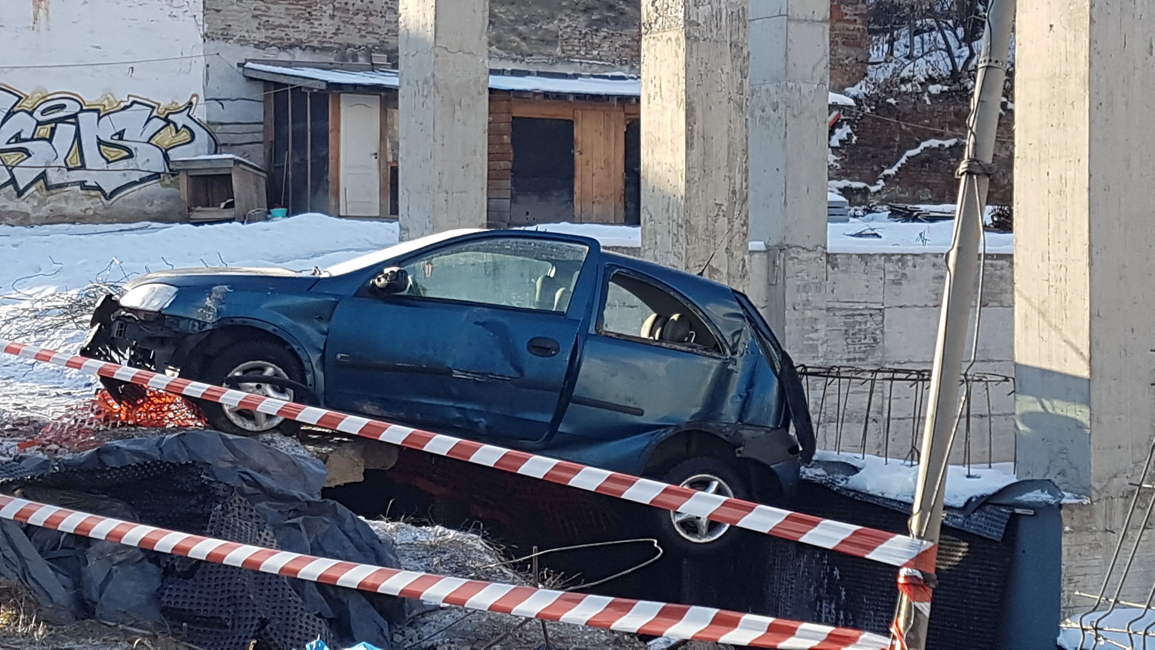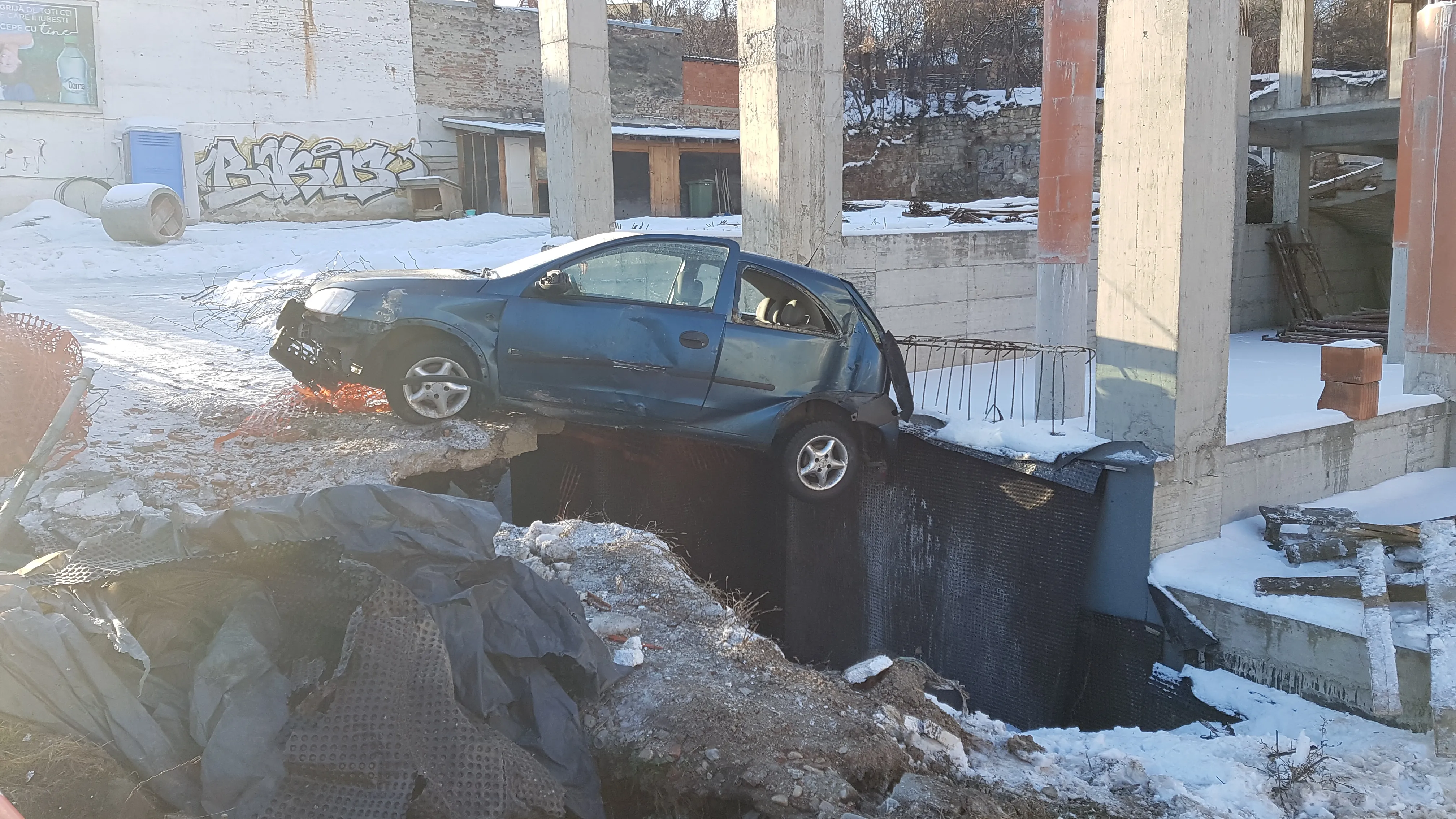 Mașina pare suspendată deasupra unei ”găuri negre”, peste subsolul clădirii. Practic, din situația de la fața locului reiese că șoferul a intrat direct pe trotuar, a rupt gardul șantierului și a zburat peste acea groapă, rămânând suspendat. Ușa era deschisă, ceea ce indică faptul că șoferul a sărit în groapă și apoi a dispărut.