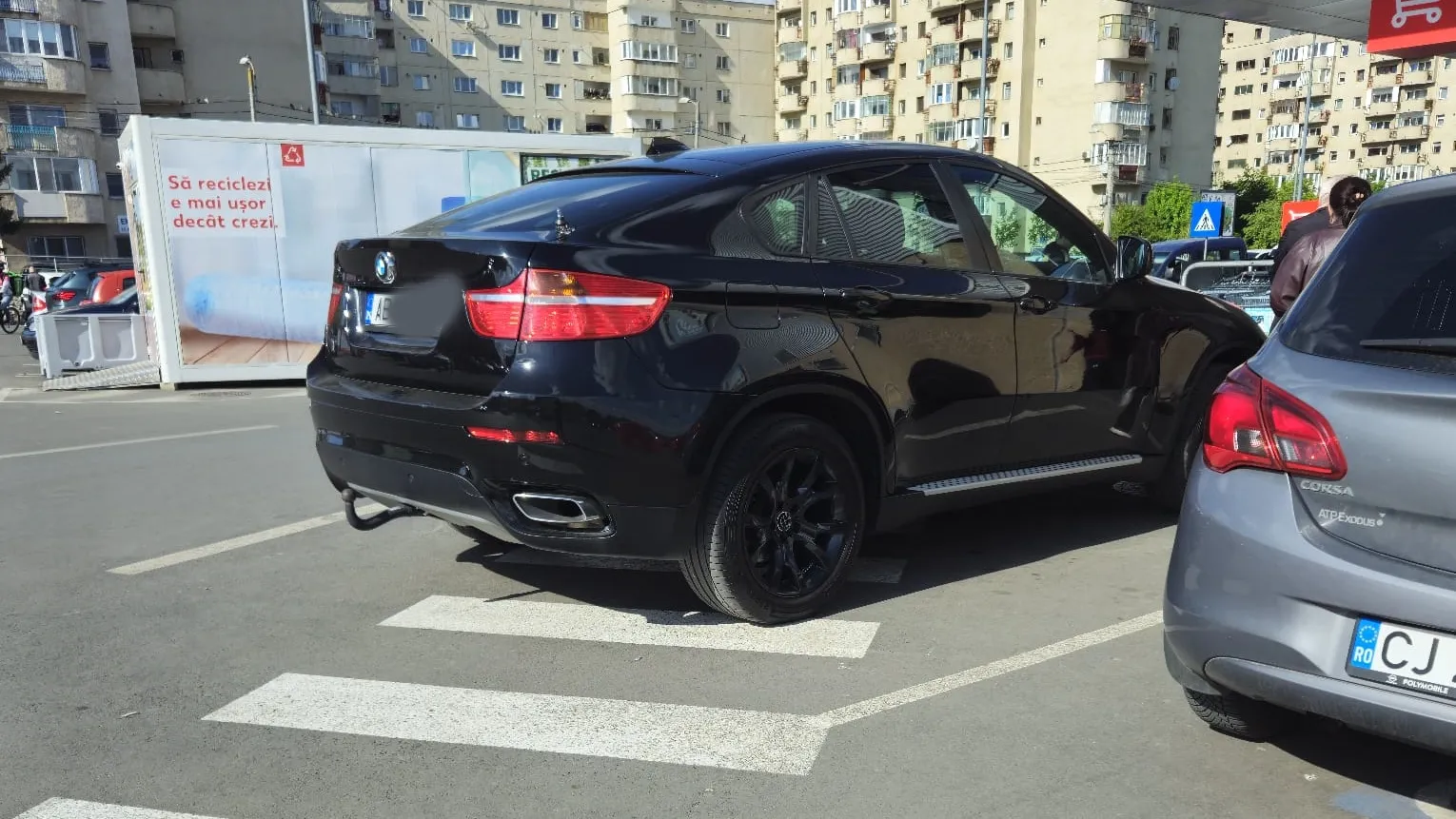 Un șofer din Alba, probabil prea comod să facă câțiva pași până la intrarea în magazin și-a lăsat bolidul de lux chiar la ușa hipermarketului.