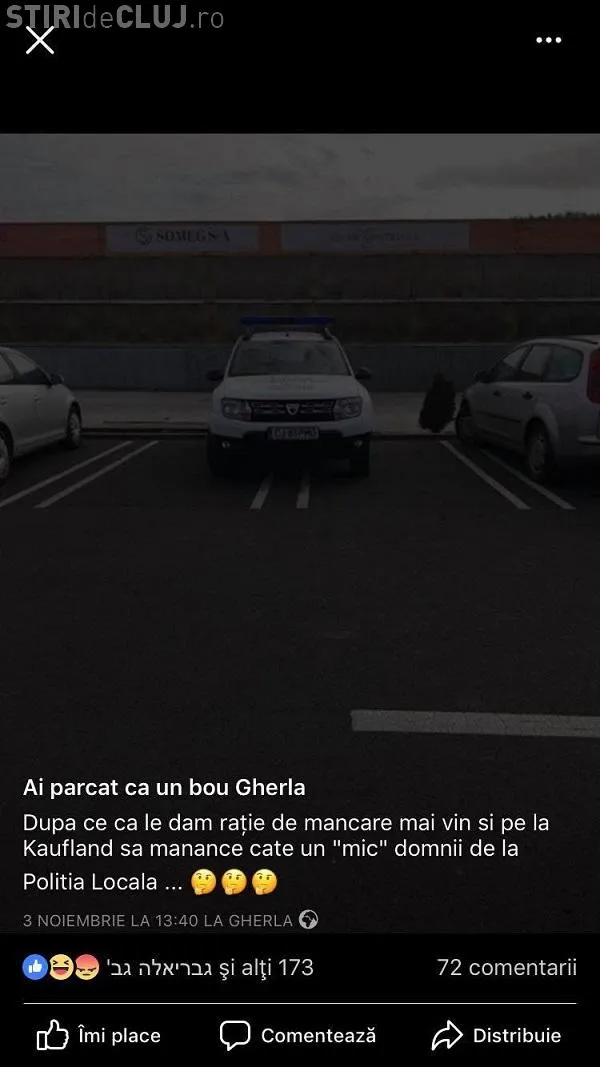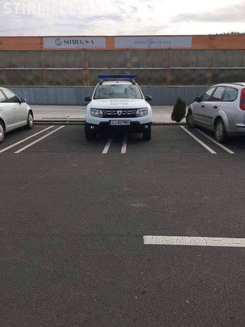 Poliția Locală din Gherla parchează în bătaie de joc. Dusterul polițiștilor a fost fotografiat în mod repetat parcat de toată rușinea în parcarea unui centru comercial.
