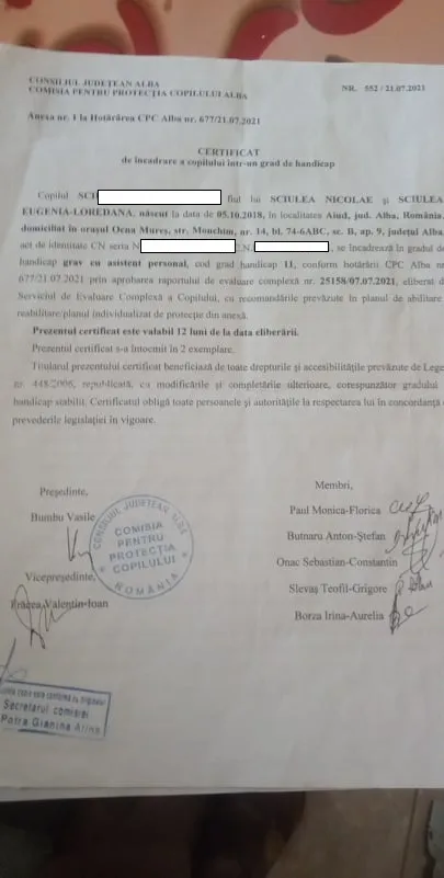 Asta e o ispravă a lui domnul polițist Rus Ciprian”, ne-a relatat Loredana Sciulea, mama copilului cu handicap.