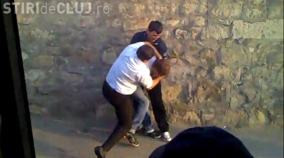 Un pasager a fost batut cu bestialitate de un sofer de autobuz intr-o statie din Someseni. Barbatul este tinut de o persoana si conducatorul auto il loveste cu pumnii si picioarele.