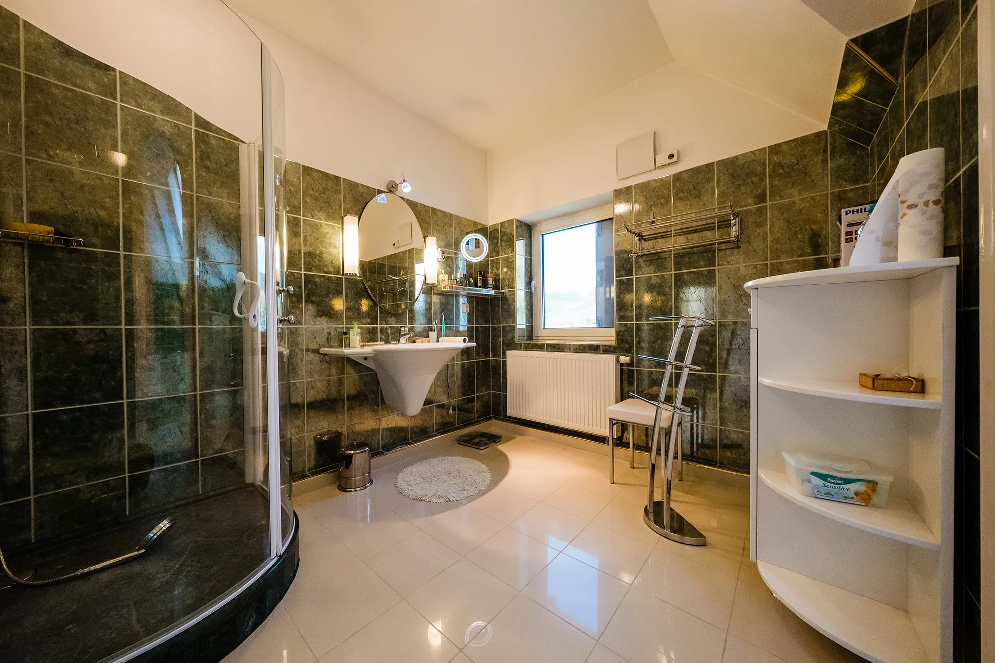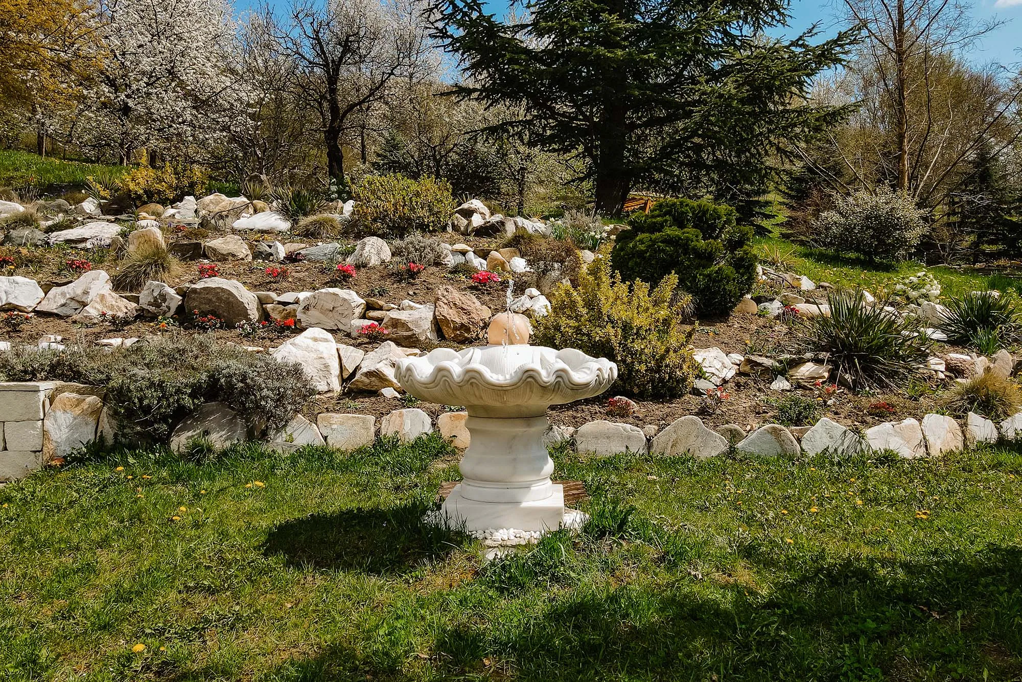 Proprietatea are curent trifazic și generatoare în caz de avarii; apa potabilă vine din rețeaua comunală̆ dar și din sursă̆ proprie (pompare de la adâncime) iar canalizarea este captată̆ în fose septice biodegradabile. Domeniul are acces la internet prin cablu cu fibră̆ optică̆ precum și antene de captare. Iluminatul perimetral și al aleilor este automatizată̆. Garajul auto are o capacitate de trei maș̦ini. Casa este dotată̆ cu sistem de supraveghere și senzori de miș̦care cuplat cu sistem de pază și protecție. Un teren de joacă̆ pentru copii a fost recent amenajat cu dotări moderne și sigure. Pentru relaxarea adulților a fost captat și amenajat un izvor, precum și o cascadă lângă care își pleacă ramurile o impresionantă salcie.