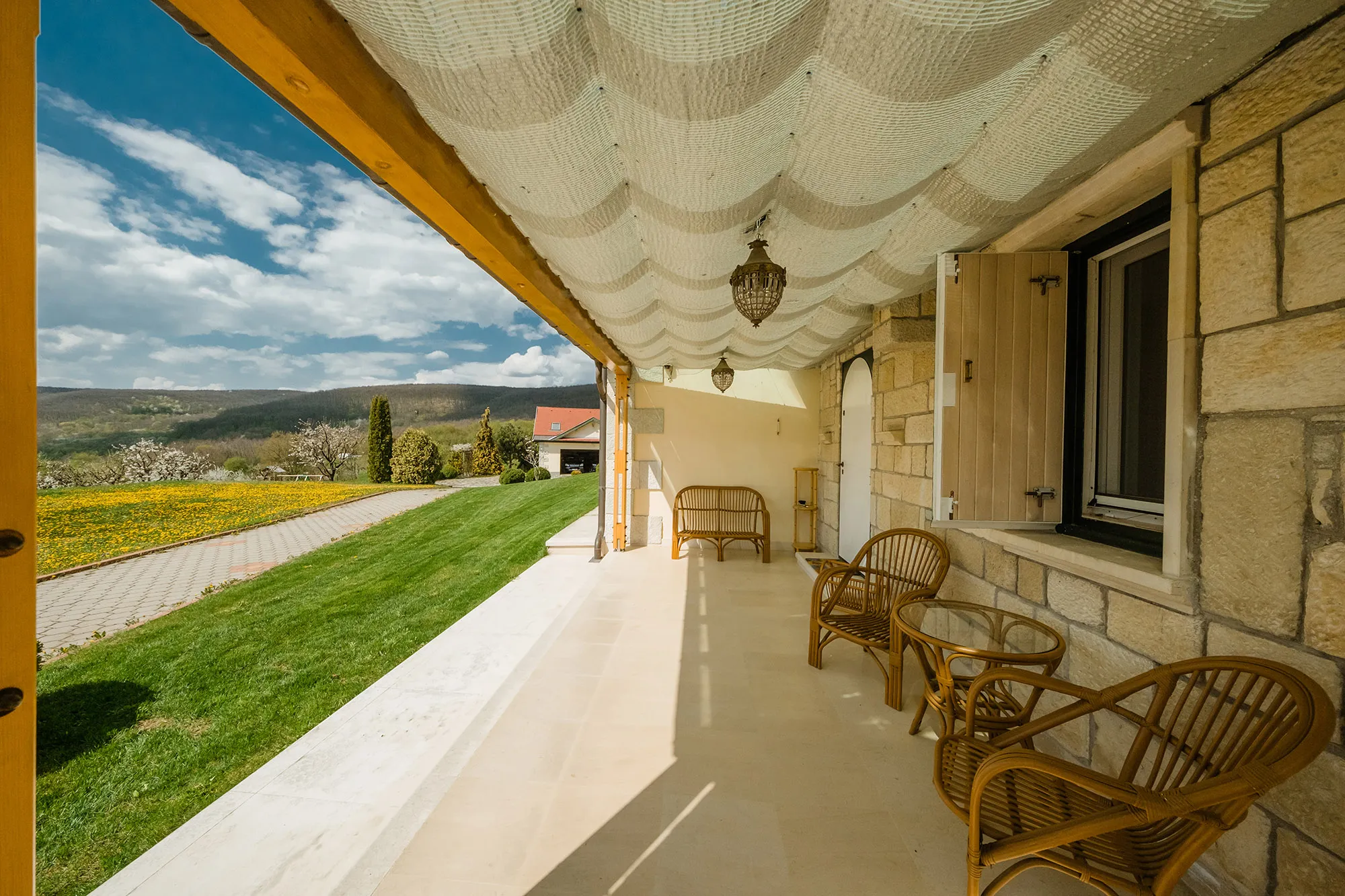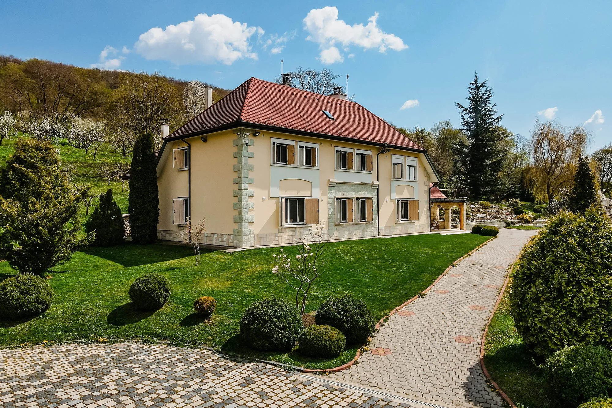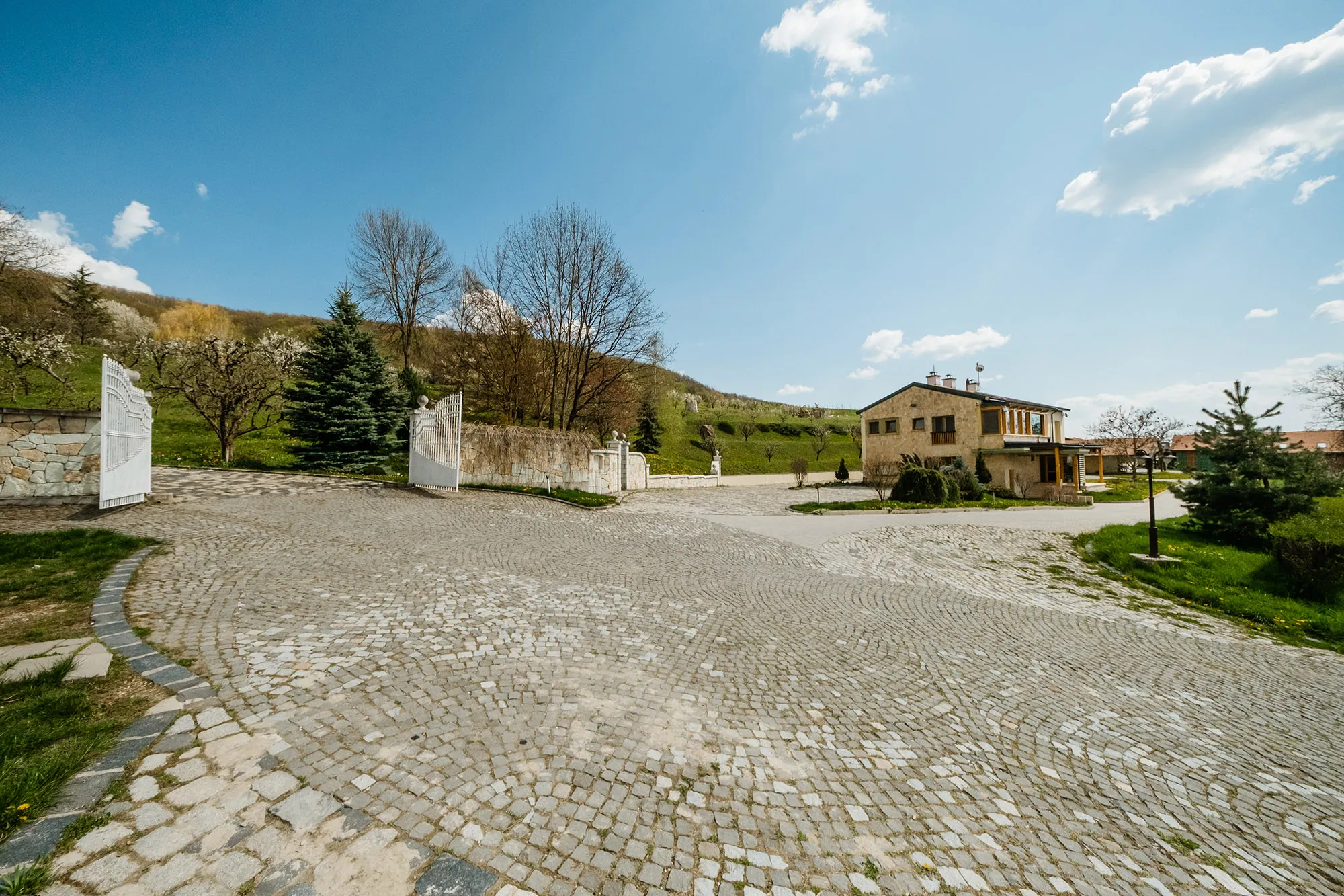 ”Domeniul este împrejmuit pe o suprafață de 12,6 ha și perimetral 2,08 km și are două căi de acces, cea secundară oferind acces la terenurile agricole (vie, livezi de pomi fructiferi și nuci, stupină). Intrarea se face printr-o elegantă poartă dublă care se deschide spre un drum pietruit ce duce la o clădire solidă, albă și ea. Construită din cărămidă și piatră casa are mușcate vesele care-i încălzesc piatra arcadelor; în interior acest rol îi revine lemnului masiv regăsit în mobilier și tâmplărie - el aduce tonuri de miere și caramel în încăperi și creează atmosfera de “acasă” (sobele cu cahle frumoase contribuie și ele).