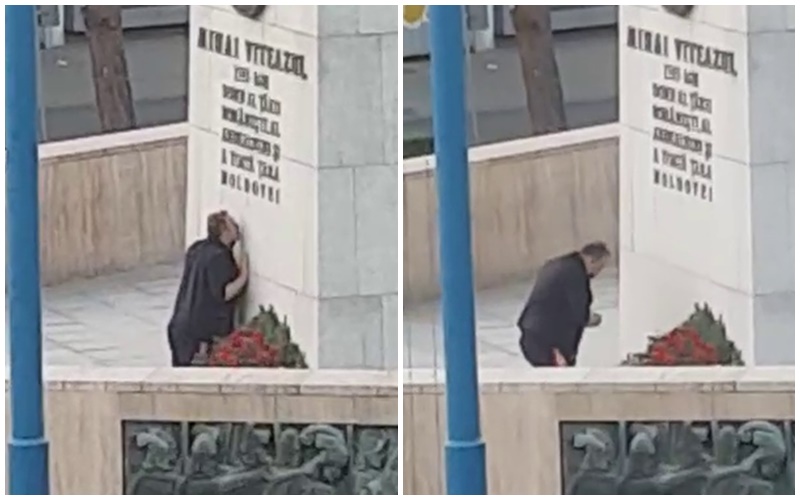 Un clujean patriot a fost surprins în timp ce se închina la statuia lui Mihai Vitreazu, din centrul Clujului.