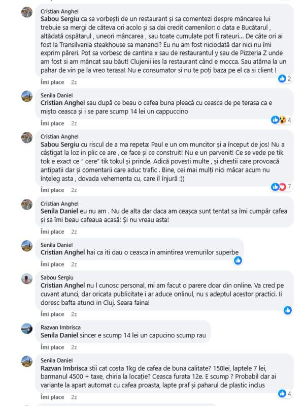Un alt interlocutor a a sărit la alt subiect și a spus că ”e scump 14 lei un cappuccino, scump rău”, iar Daniel Șenilă i-a explicat costurile: ”Știi cât costă 1 kg de cafea de bună calitate? 150 lei, laptele 7 lei, barmanul 4500 + taxe, chiria la locație? Ceașca furată 12 euro. E scump? Probabil, dar ai variante la aparatul automat cu cafea proastă, lapte praf și paharul de plastic inclus”.