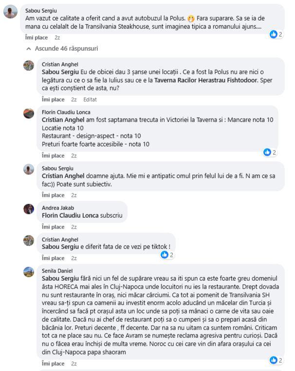 Unul dintre urmăritori, Sergiu S., a spus că Pescobar e la fel ca patronul Transilvania Steakhouse, Avram Gal. ”Am văzut ce calitate a oferit (Pescobar) când a avut autobuzul la Polus. Fără supărare. Să se ia de mână cu celălalt de la Transilvania Steakhouse, sunt imaginea tipică a romanului ajuns....”. Altcineva i-a recomandat nemulțumitului să dea trei șanse unei locații, nu să critice din prima, dar degeaba. ”Mie mi-e antipatic omul prin felul lui de a fi. N-am ce să fac! Poate sunt subiectiv”, a susținut în continuare Sergiu S.