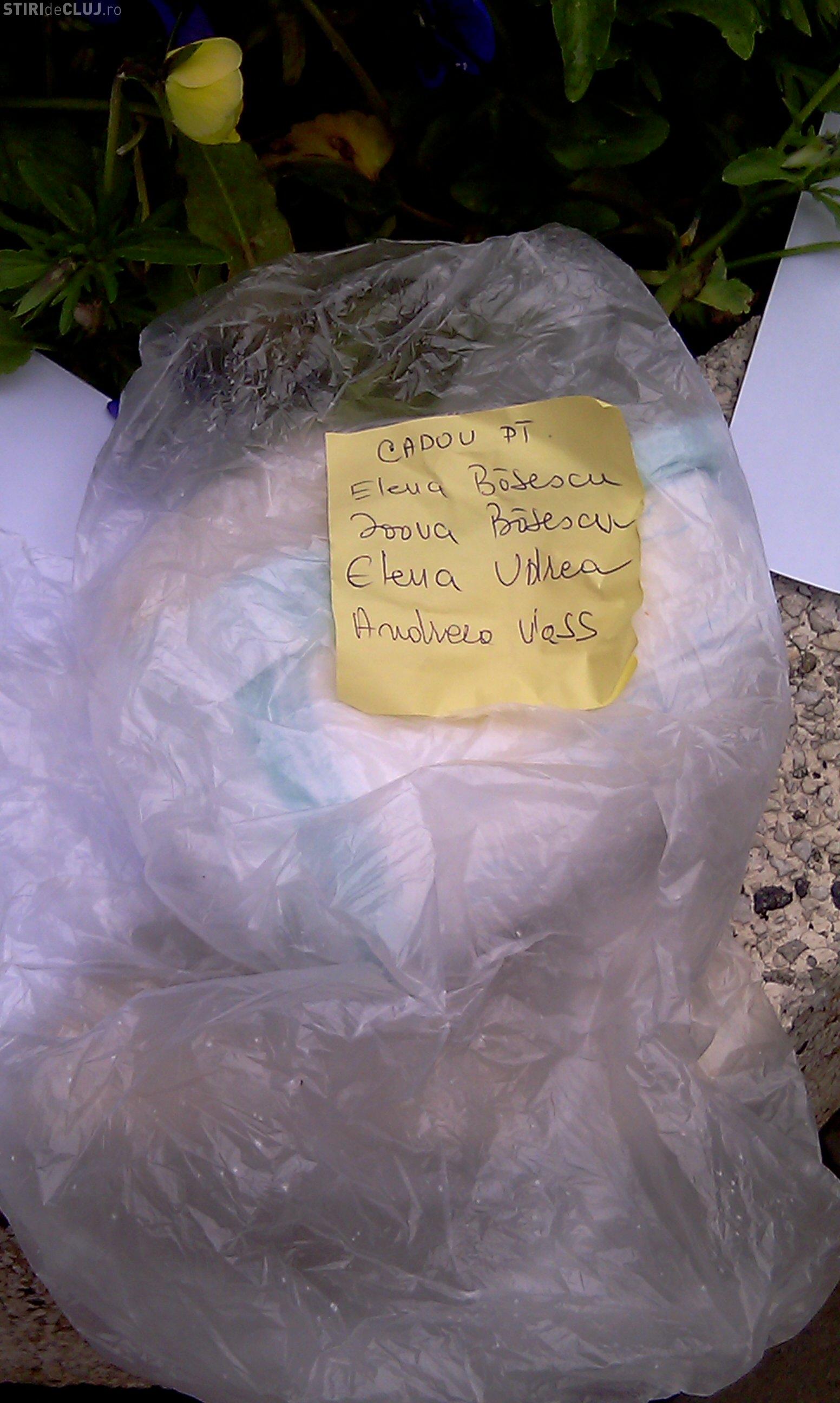 Dupa ce au stat minute bune in fata Prefecturii Cluj, una dintre mamici a urcat pentru a inmana cele doua bucati de Pampers folosite prefectului. Si cum acesta nu era, mostrele au fost "oferite", pentru a le da mai departe, subprefectului Vasile Cozma.