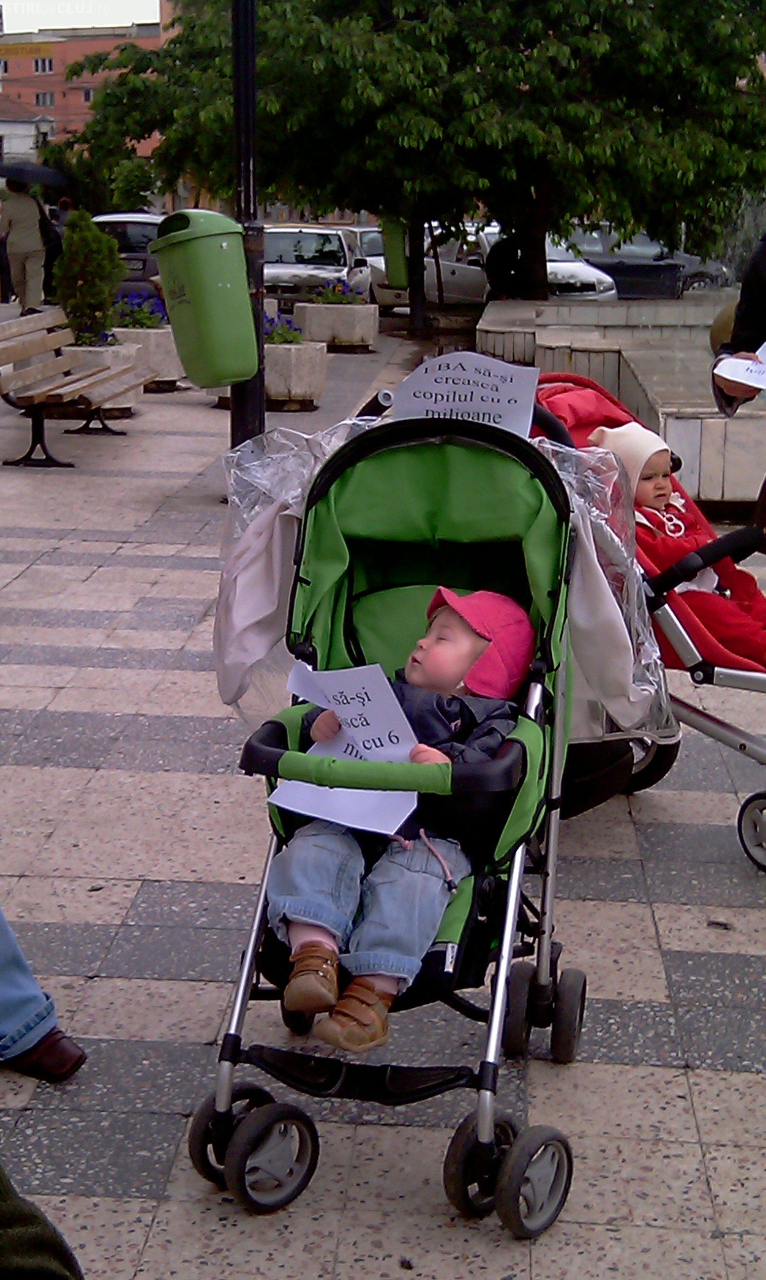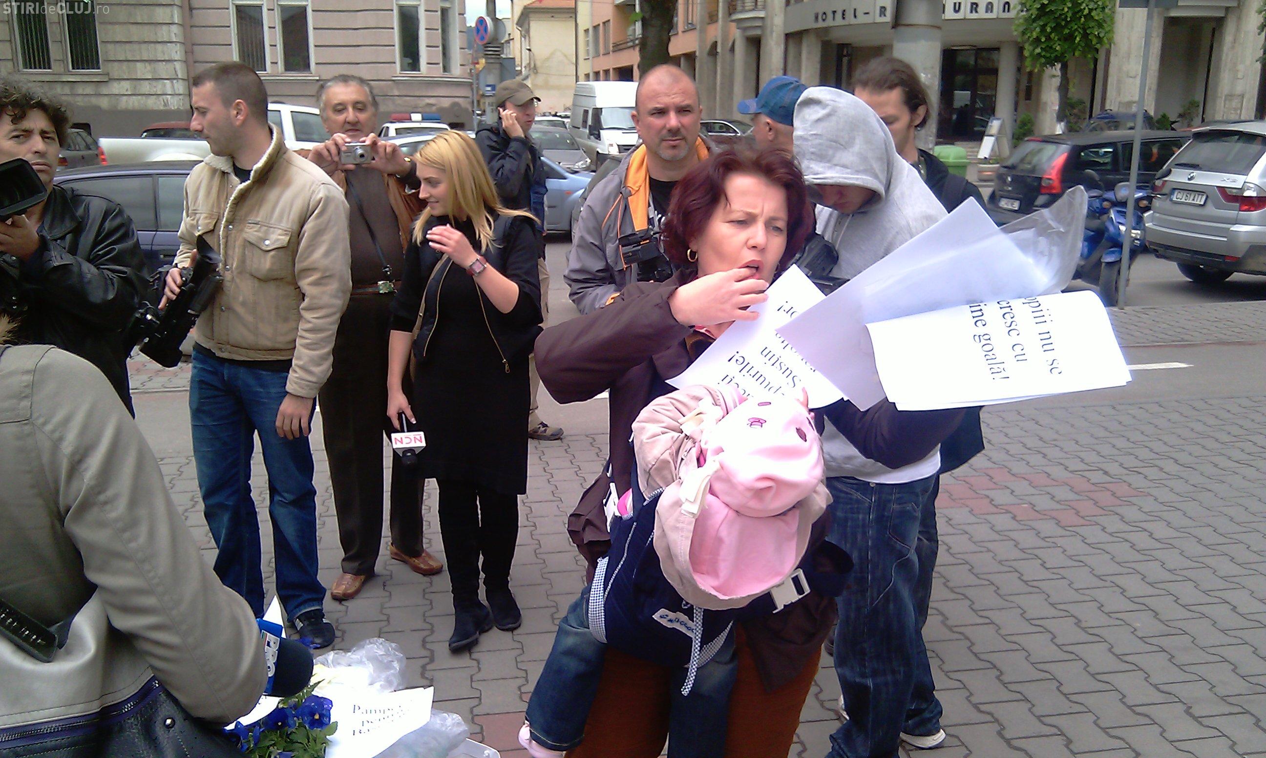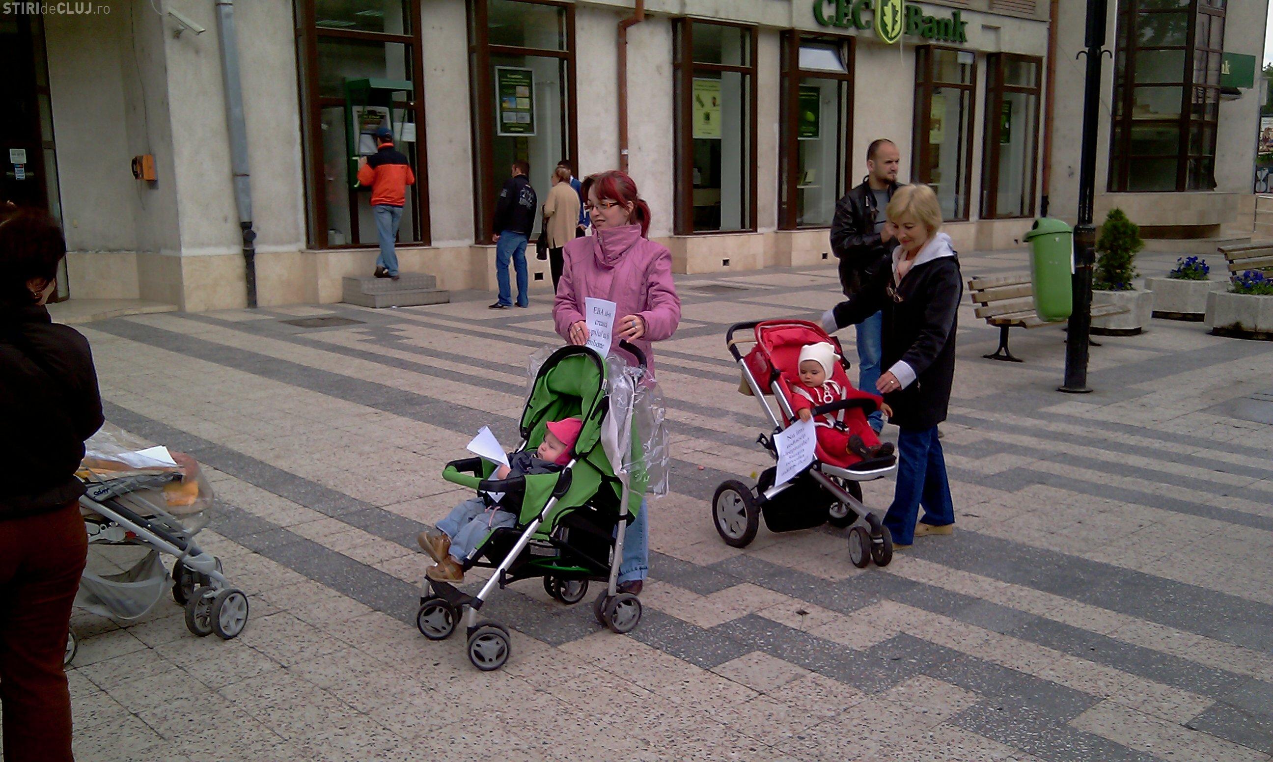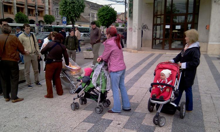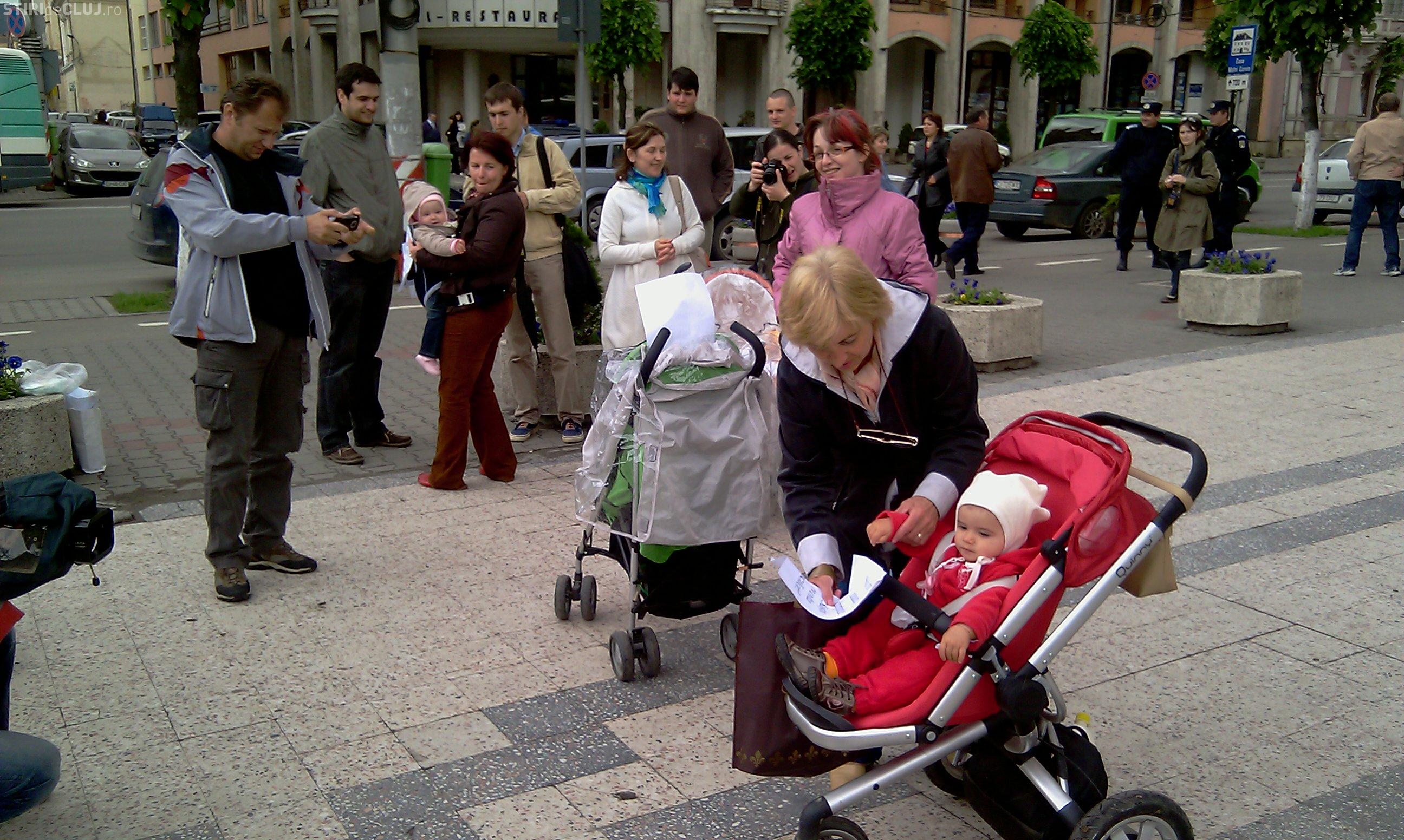Doar patru mamici au protestat astazi in fata Prefecturii Cluj! Ele i-au inmanat subprefectului doi pampersi folositi - VIDEO si Galerie FOTO