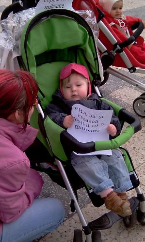 "EBA sa isi creasca copiulul cu 6 milioane pe luna", "Muritorii de foame azi, emigrantii de maine', " Pampersi pentru Basescu", "Nu imi reducedi drepturile, sustin revolta mamicilor", "Copii nu se cresc in pielea goala" au fost mesajele pe care mamicile le-au inscriptionat pe pampersi.Unul dintre ei ii era destinat lui Traian Basescu, iar cel de-al doilea Elenei Udrea, Elenei Basescu, Ioanei Basescu si Andreei Vass.