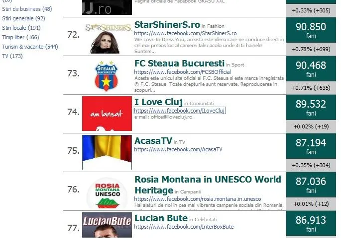 Pagina site -ului Stiri de Cluj este apreciata de 7.134 de fani si ocupa locul 1057 intr-un top national care aduna peste 15.000 de pagini.
