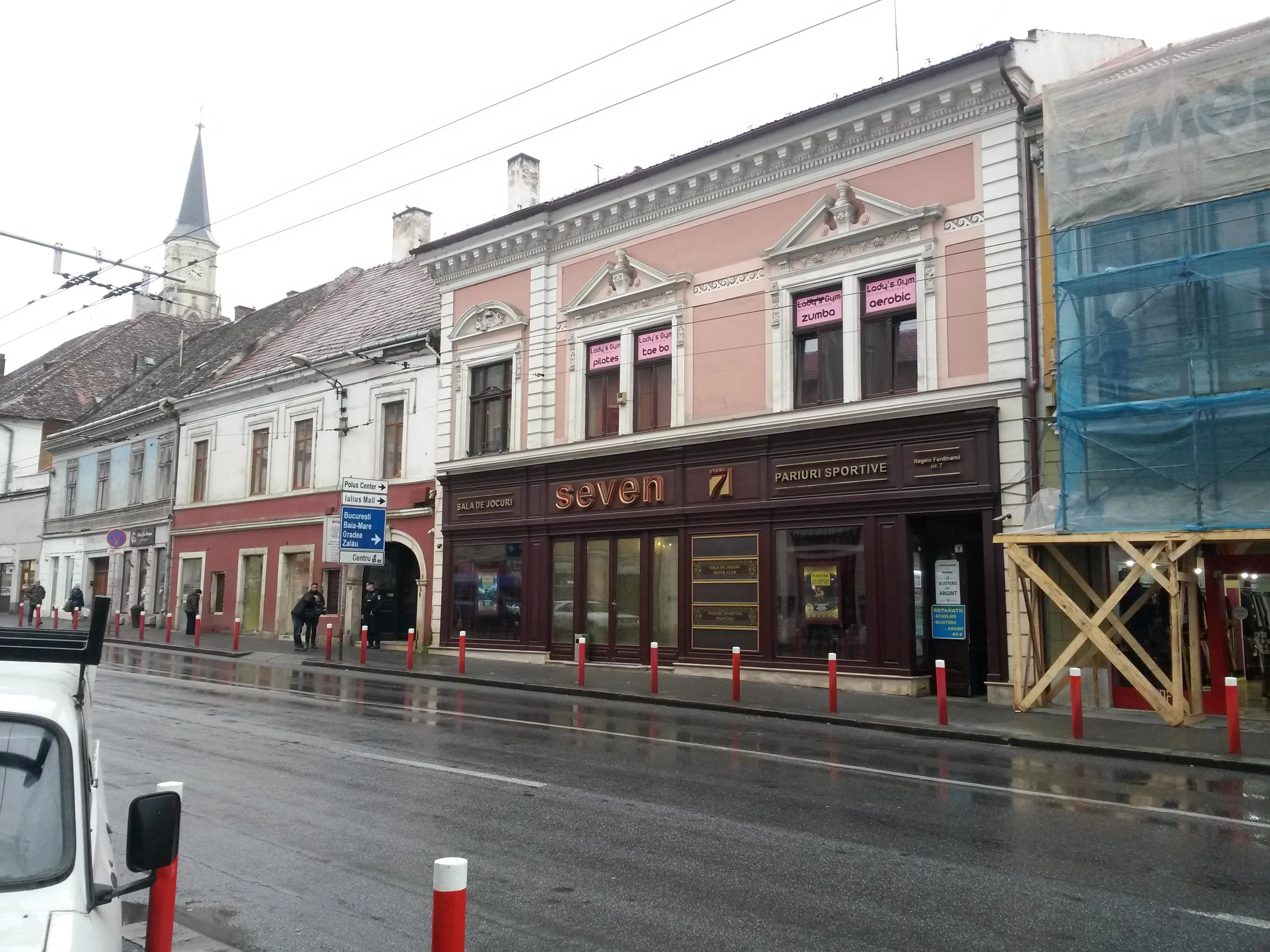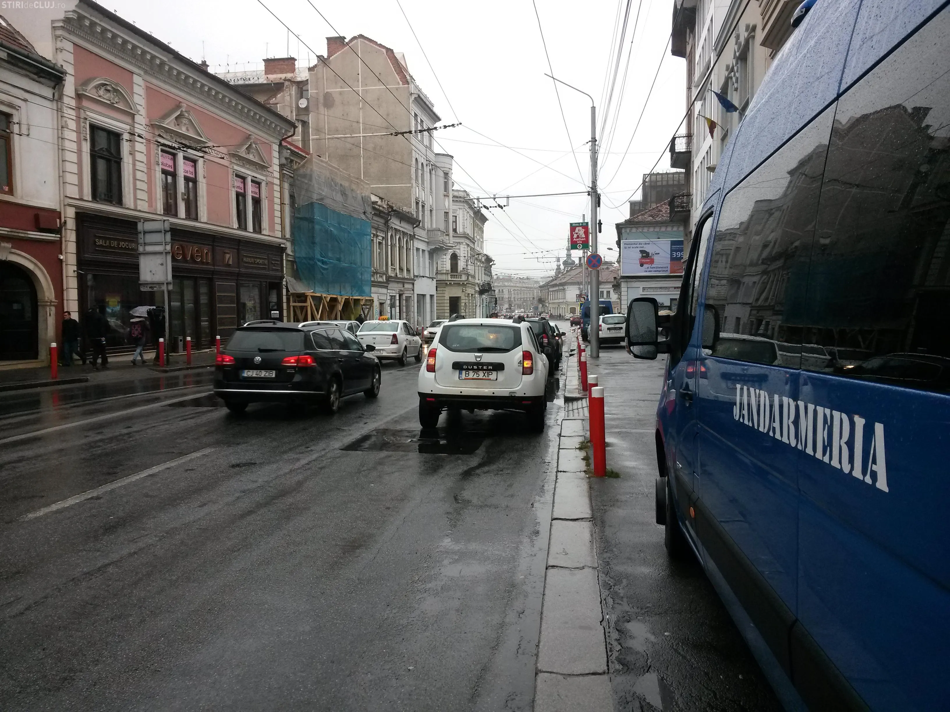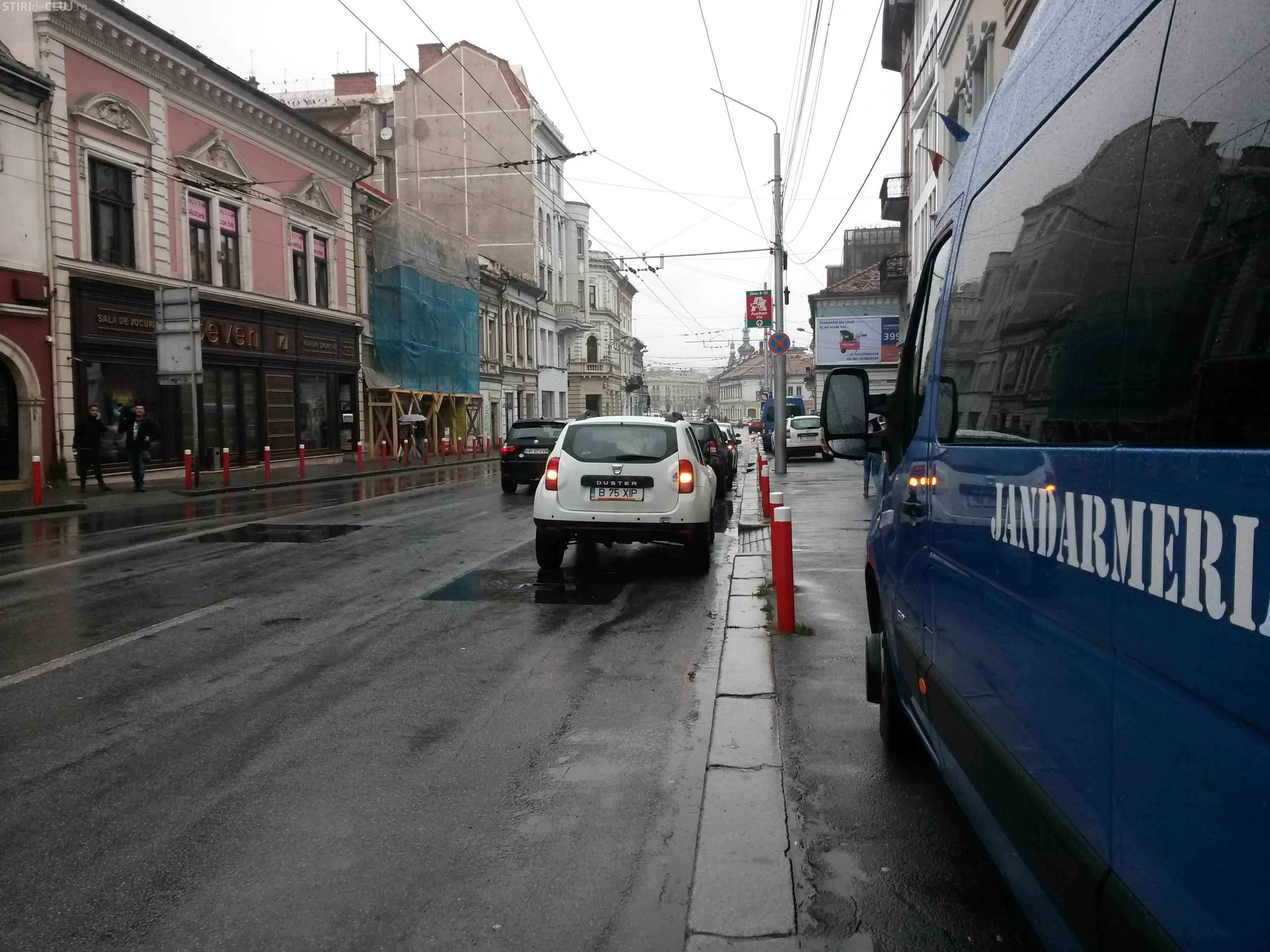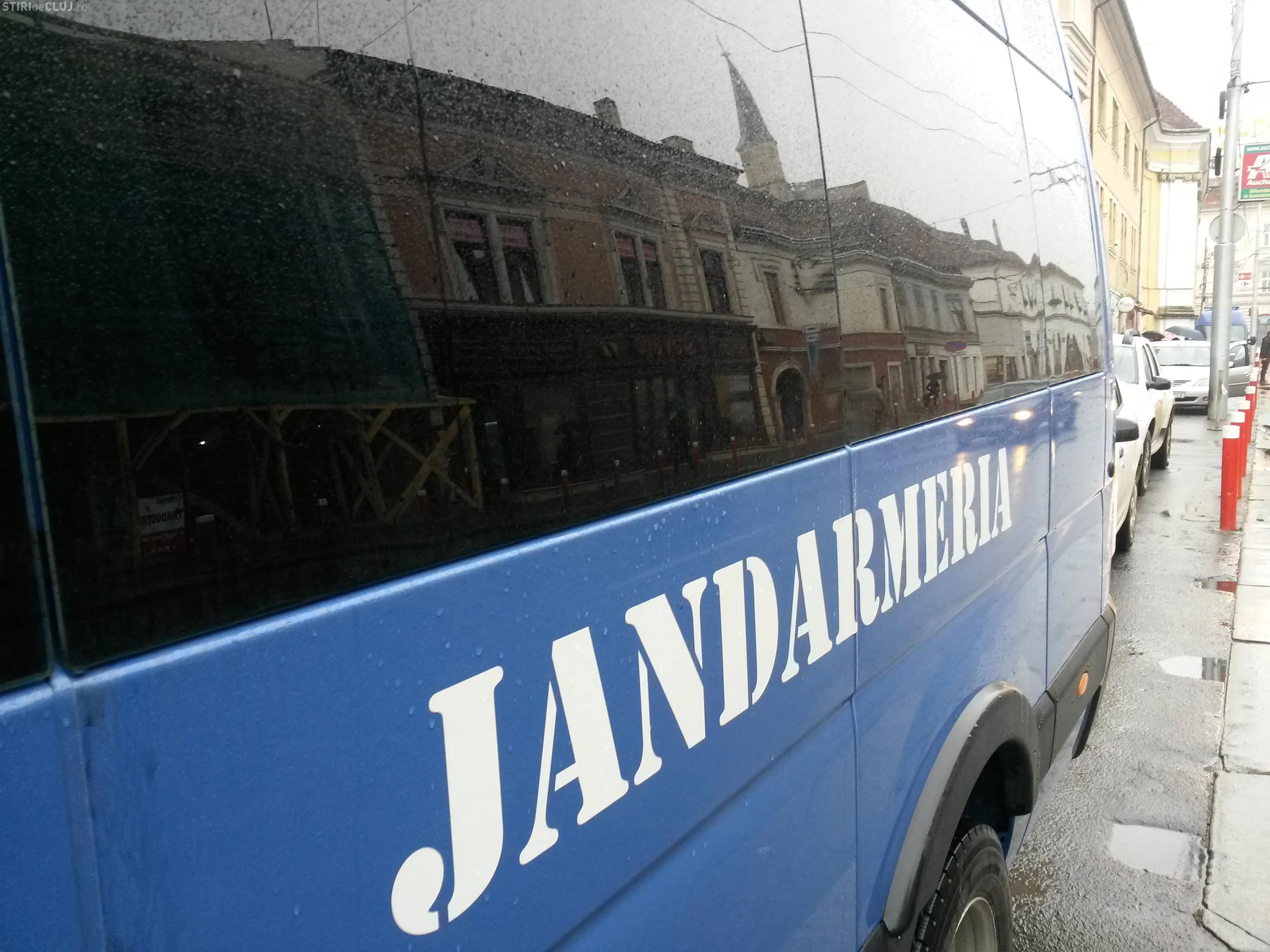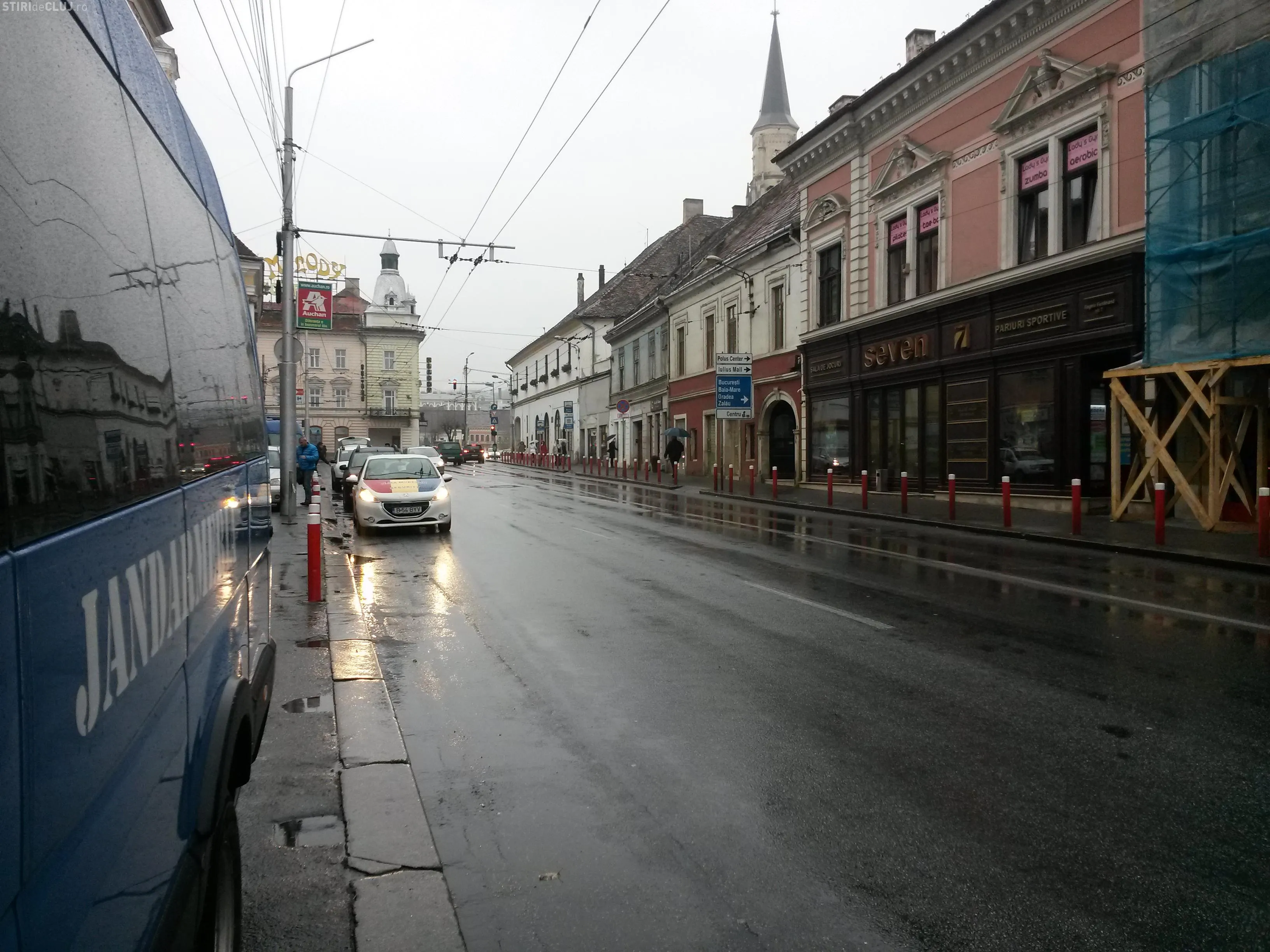 Două dube de jandarmi erau postate în fața clubului Seven de pe strada Ferdinand, din centrul Clujului.