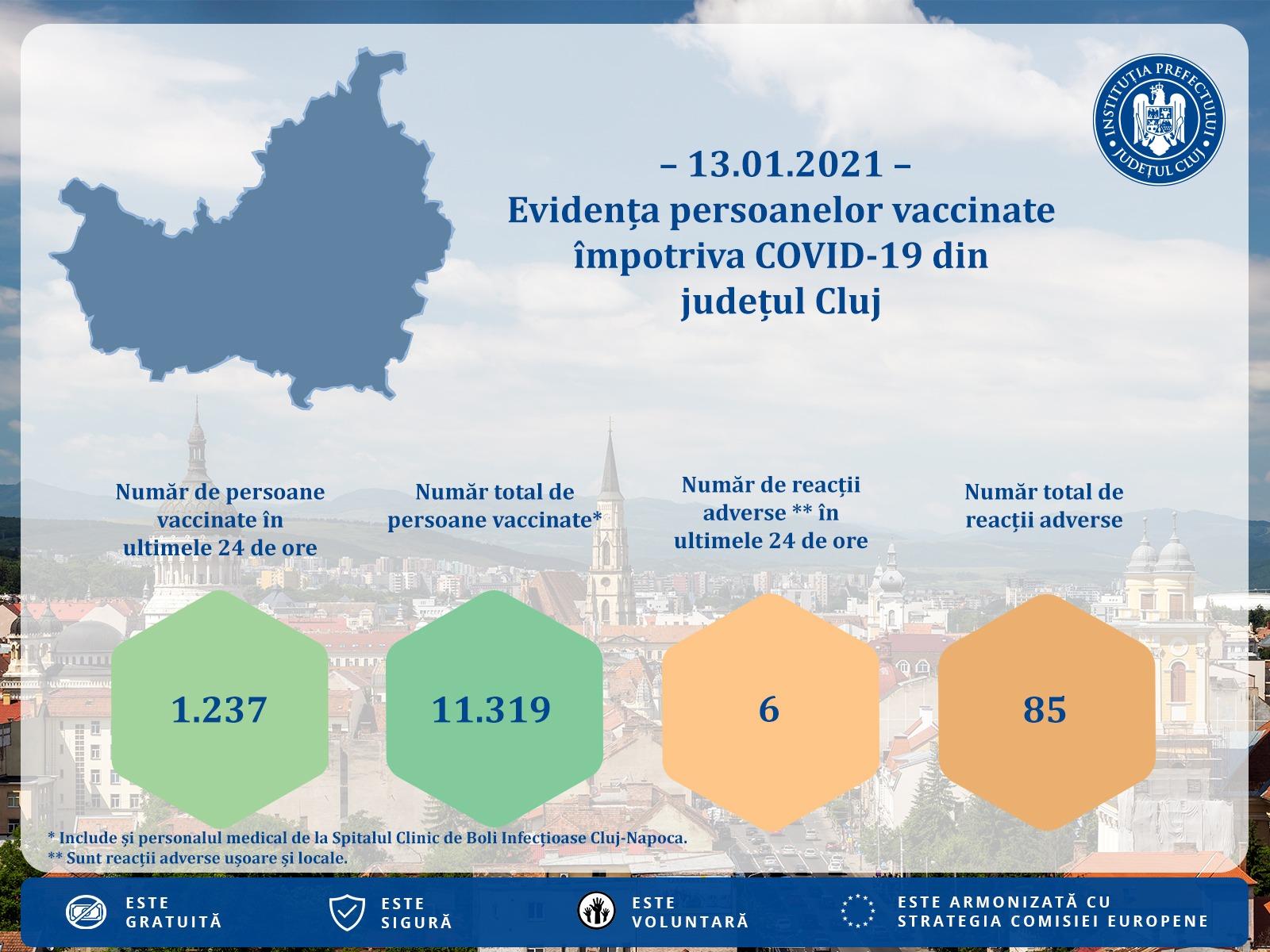 Astfel, numărul persoanelor vaccinate de pe raza județului Cluj a ajuns la 11.319. Acest număr include, de asemenea, și personalul medical de la Spitalul Clinic de Boli Infecțioase Cluj-Napoca.